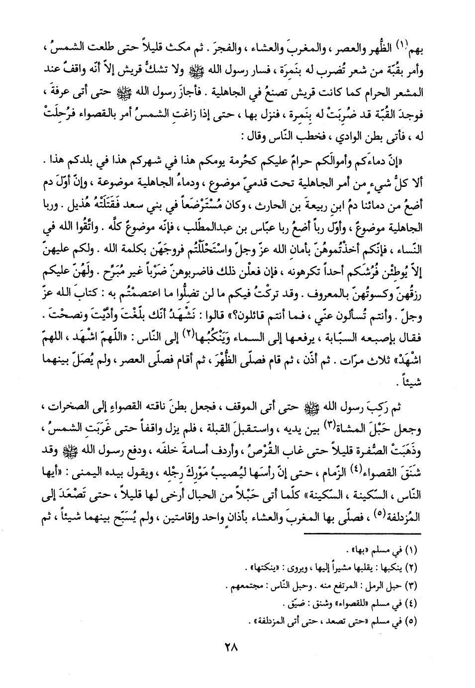 "إنّ دماءَكم وأموالَكم حرامٌ عليكم كحُرمة يومكم هذا في شهركم هذا في بلدكم هذا. ألا كلُّ شيءٍ من أمر الجاهلية تحت قدميّ موضوع، ودماءُ الجاهلية موضوعة، وإنّ أوّلَ دم أضعُ من دمائنا دمُ ابنِ ربيعةَ بن الحارث، وكان مُسْتَرْضَعًا في بني سعد فَقَتَلَتْهُ هُذيل. وربا الجاهلية موضوعٌ، وأوّل ربًا أضعُ ربا عبّاس بن عبد المطّلب، فإنّه موضوعٌ كلَّه. واتَّقُوا اللَّه في النّساء، فإنّكم أخذْتُموهُنّ بأمانِ اللَّه عزّ وجلّ واسْتَحْلَلْتُم فروجَهّن بكلمة اللَّه. ولكم عليهنّ إلّا يُوطِئْن فُرُشَكم أحدًا تكرهونه، فإن فعلْن ذلك فاضربوهنّ ضَرْبًا غير مُبَرِّح. ولَهُنّ عليكم رزقُهنَّ وكسوتُهنّ بالمعروف. وقد تركْتُ فيكم ما لن تضِلُّوا ما اعتصمْتُم به: كتابَ اللَّه عزّ وجلّ. وأنتم تُسألون عنّي، فما أنتم قائلون؟ " قالوا: نَشْهَدُ أنّك بلّغْتَ وأدَّيْتَ ونصحْتَ. فقال بإصبعه السبّابة، يرفعها إلى السماء وَيَنْكُبُها (٢) إلى النّاس: "اللهمّ اشْهَد، اللهمّ اشْهَدْ" ثلاث مرّات. ثم أذّن، ثم قام فصلّى الظُهْرَ، ثم أقام فصلّى العصر، ولم يُصَلّ بينهما شيئًا.