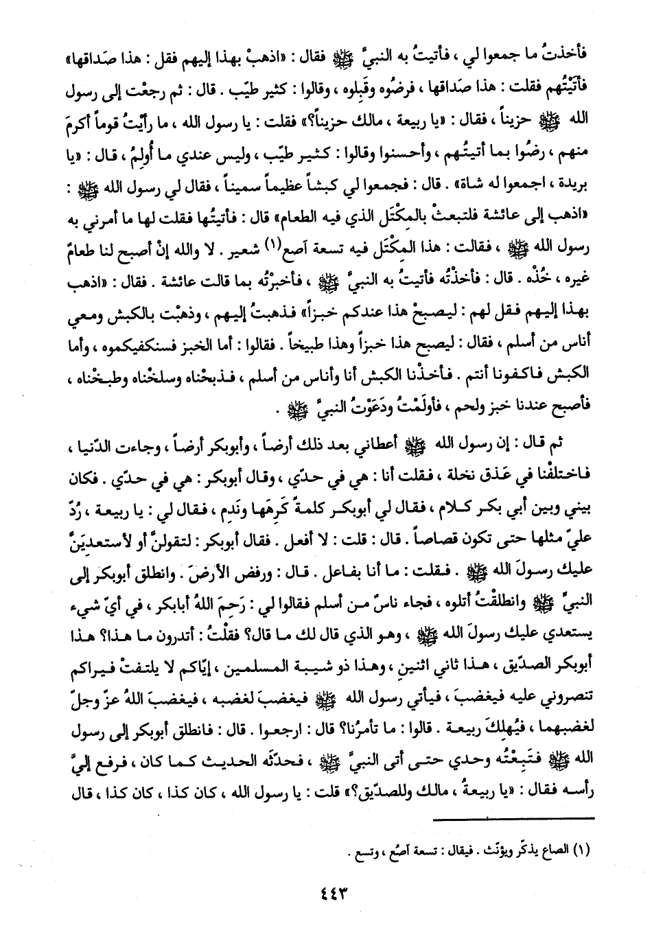 فأخذتُ ما جمعوا لي، فأتيتُ به النبيَّ -صلى اللَّه عليه وسلم- فقال: "اذهبْ بهذا إليهم فقل: هذا صَداقها" فأتَيْتُهم فقلت: هذا صَداقها، فرضُوه وقَبِلوه، وقالوا: كثير طيّب. قال: ثم رجعْت إلى رسول اللَّه -صلى اللَّه عليه وسلم- حزينًا، فقال: "يا ربيعة، مالك حزينًا؟ " فقلت: يا رسول اللَّه، ما رأيْتُ قومًا أكرمَ منهم، رضُوا بما أتيتُهم، وأحسنوا وقالوا: كثير طيّب، وليس عندي ما أُولِمُ، قال: "يا بريدة، اجمعوا له شاة". قال: فجمعوا لي كبشًا عظيمًا سمينًا، فقال لي رسول اللَّه -صلى اللَّه عليه وسلم-: "اذهب إلى عائشة فلتبعثْ بالمِكْتَل الذي فيه الطعام" قال: فأتيتُها فقلت لها ما أمرني به رسول اللَّه -صلى اللَّه عليه وسلم-، فقالت: هذا المِكْتَل فيه تسعة آصع (١) شعير. لا واللَّه إنْ أصبح لنا طعامٌ غيره، خُذْه. قال: فأخذْتُه فأتيتُ به النبيَّ -صلى اللَّه عليه وسلم-، فأخبرْتُه بما قالت عائشة. فقال: "اذهب بهذا إليهم فقل لهم: ليصبحْ هذا عندكم خبزًا" فذهبتُ إليهم، وذهبْت بالكبش ومعي أناس من أسلم، فقال: ليصبح هذا خبزًا وهذا طبيخًا. فقالوا: أما الخبز فسنكفيكموه، وأما الكبش فاكفونا أنتم. فأخذْنا الكبش أنا وأناس من أسلم، فذبحْناه وسلخْناه وطبخْناه، فأصبح عندنا خبز ولحم، فأولَمْتُ ودَعَوْتُ النبيَّ -صلى اللَّه عليه وسلم-.