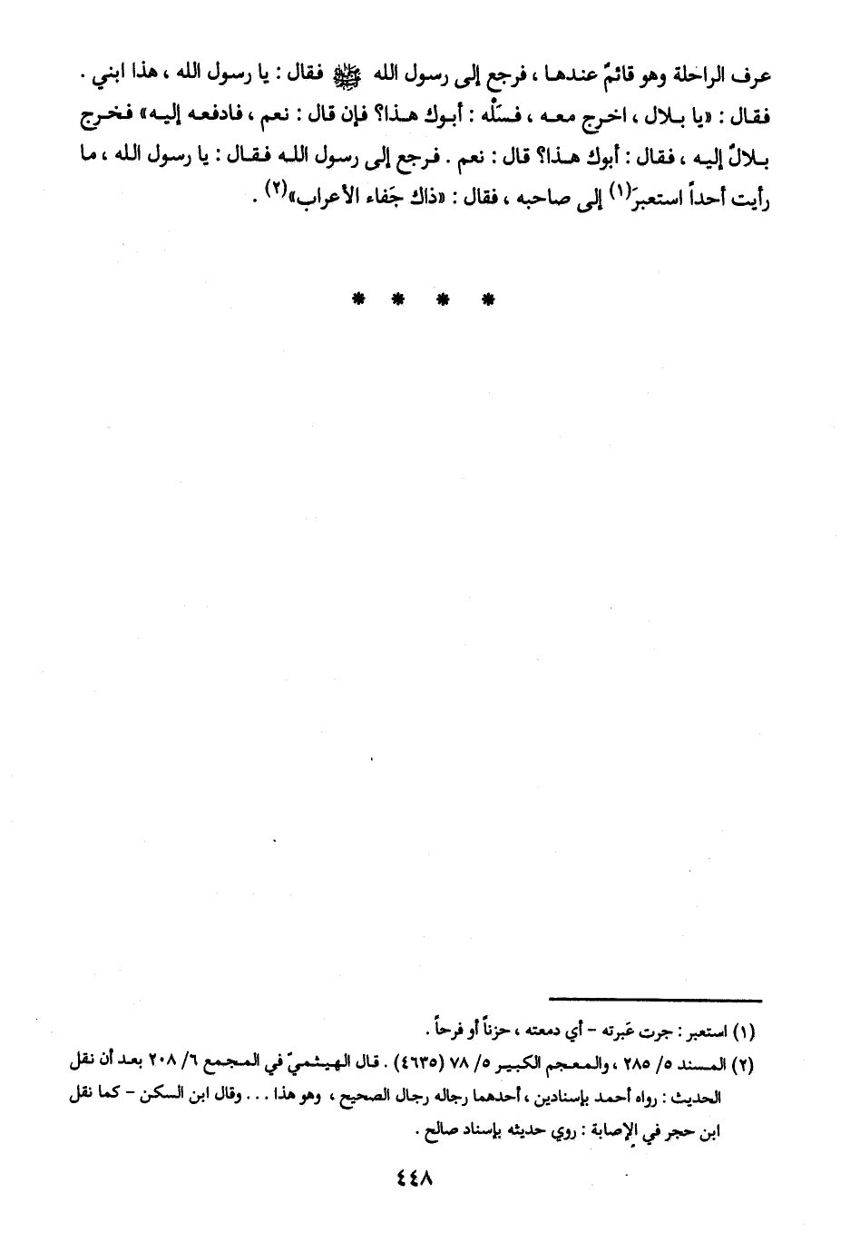 عرف الراحلة وهو قائمٌ عندها، فرجع إلى رسول اللَّه -صلى اللَّه عليه وسلم- فقال: يا رسول اللَّه، هذا ابني. فقال: "يا بلال، اخرج معه، فسَلْه: أبوك هذا؟ فإن قال: نعم، فادفعه إليه" فخرج بلالٌ إليه، فقال: أبوك هذا؟ قال: نعم. فرجع إلى رسول اللَّه فقال: يا رسول اللَّه، ما رأيت أحدًا استعبرَ (١) إلى صاحبه، فقال: "ذاك جَفاء الأعراب" (٢).