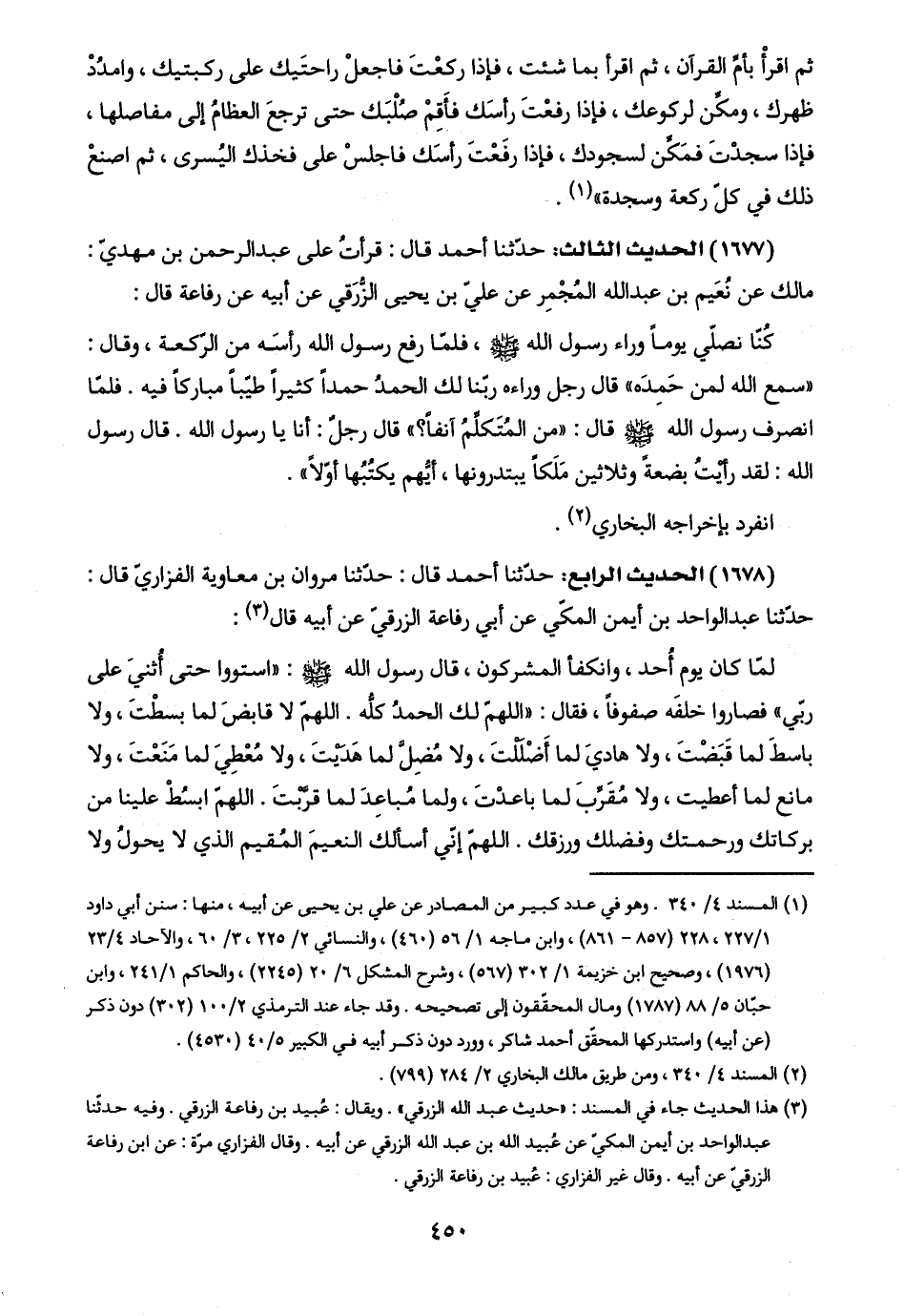 (١٦٧٧) الحديث الثالث: حدّثنا أحمد قال: قرأتُ على عبد الرحمن بن مهديّ: مالك عن نُعَيم بن عبد اللَّه المُجْمِر عن عليّ بن يحيى الزُّرَقي عن أبيه عن رفاعة قال: