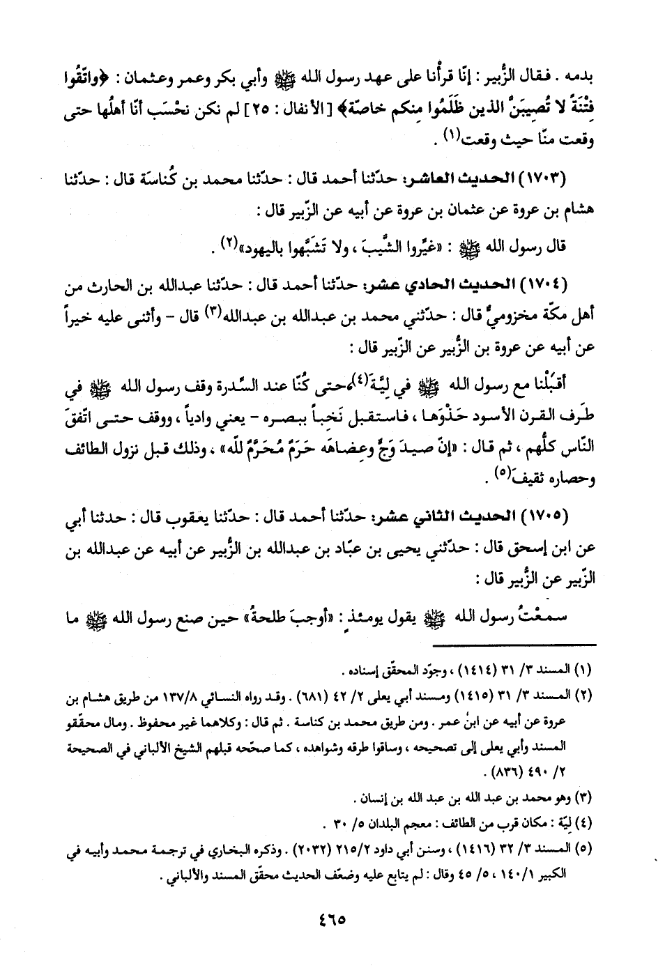 (١٧٠٣) الحديث العاشر: حدّثنا أحمد قال: حدّثنا محمد بن كُناسَة قال: حدّثنا هشام بن عروة عن عثمان بن عروة عن أبيه عن الزّبير قال: