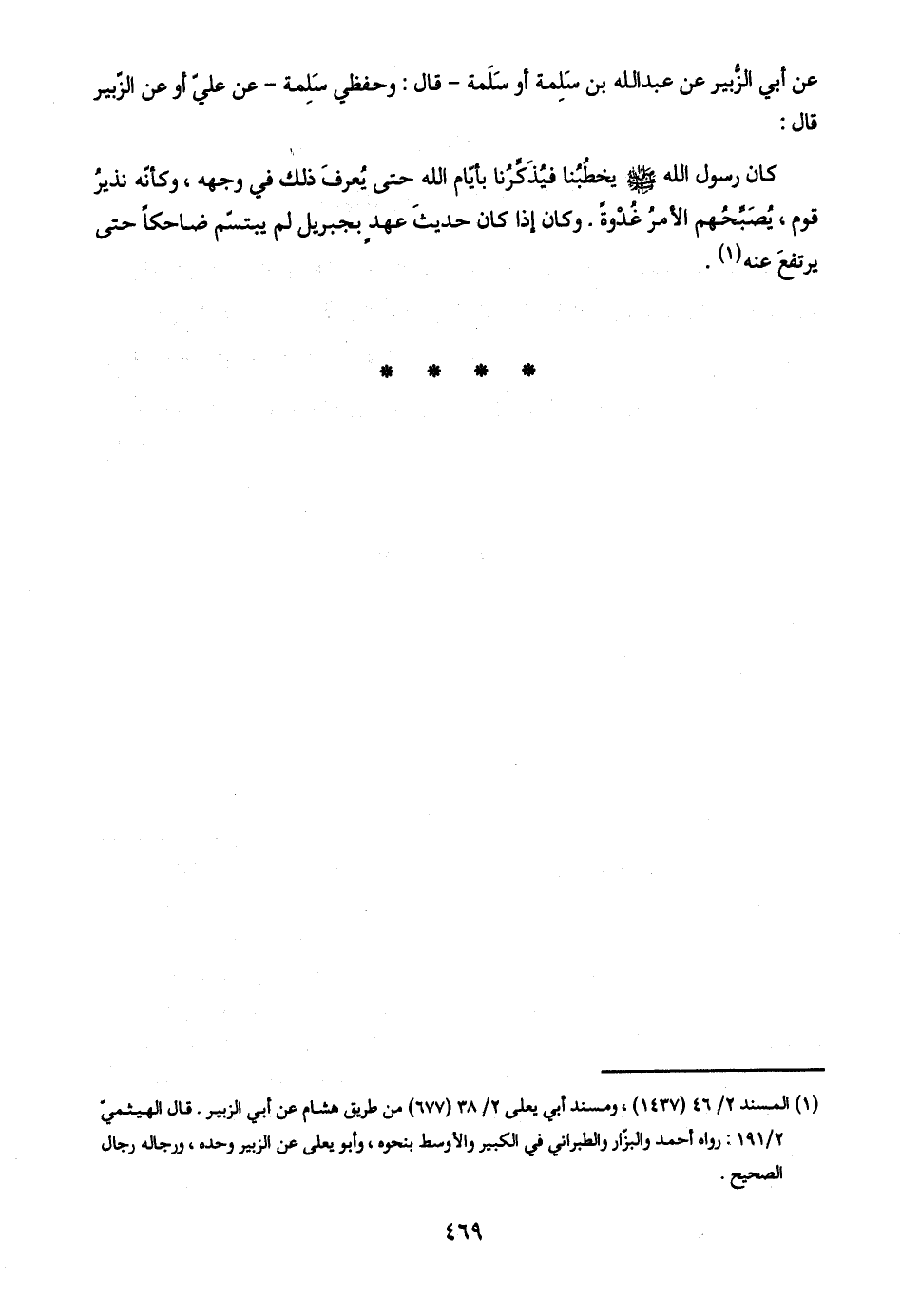 (١) المسند ٢/ ٤٦ (١٤٣٧)، ومسند أبي يعلى ٢/ ٣٨ (٦٧٧) من طريق هشام عن أبي الزبير. قال الهيثمي ٢/ ١٩١: رواه أحمد والبزار والطبراني في الكبير والأوسط بنحوه، وأبو يعلى عن الزبير وحده، ورجاله رجال الصحيح.