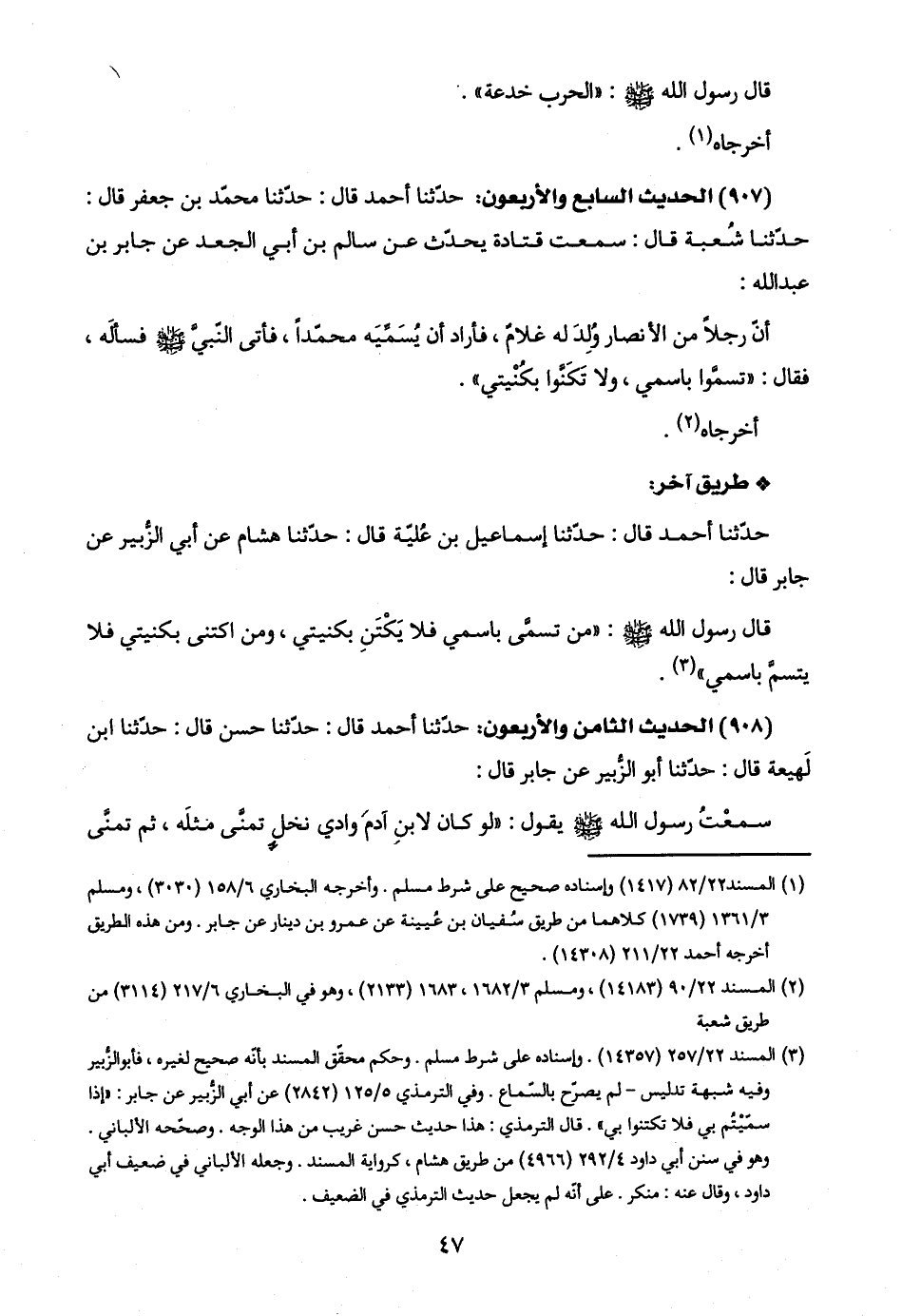 (٣) المسند ٢٢/ ٢٥٧ (١٤٣٥٧). وإسناده على شرط مسلم. وحكم محقّق المسند بأنّه صحيح لغيره، فأبو الزُّبير وفيه شبهة تدليس - لم يصرّح بالسّماع. وفي الترمذي ٥/ ١٢٥ (٢٨٤٢) عن أبي الزُّبير عن جابر: "إذا سمَيْتُم بي فلا تكتنوا بي". قال الترمذي: هذا حديث حسن غريب من هذا الوجه. وصحّحه الألباني. وهو في سنن أبي داود ٤/ ٢٩٢ (٤٩٦٦) من طريق هشام، كرواية المسند. وجعله الألباني في ضعيف أبي داود، وقال عنه: منكر. على أنّه لم يجعل حديث الترمذي في الضعيف.