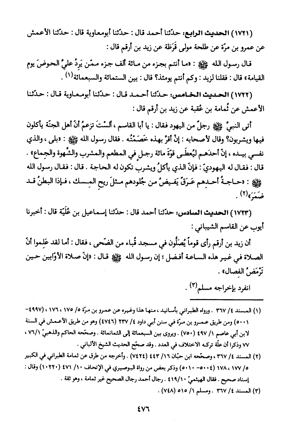 (١٧٢١) الحديث الرابع: حدّثنا أحمد قال: حدّثنا أبو معاوية قال: حدّثنا الأعمش عن عمرو بن مرّة عن طلحة مولى قَرَظة عن زيد بن أرقم قال: