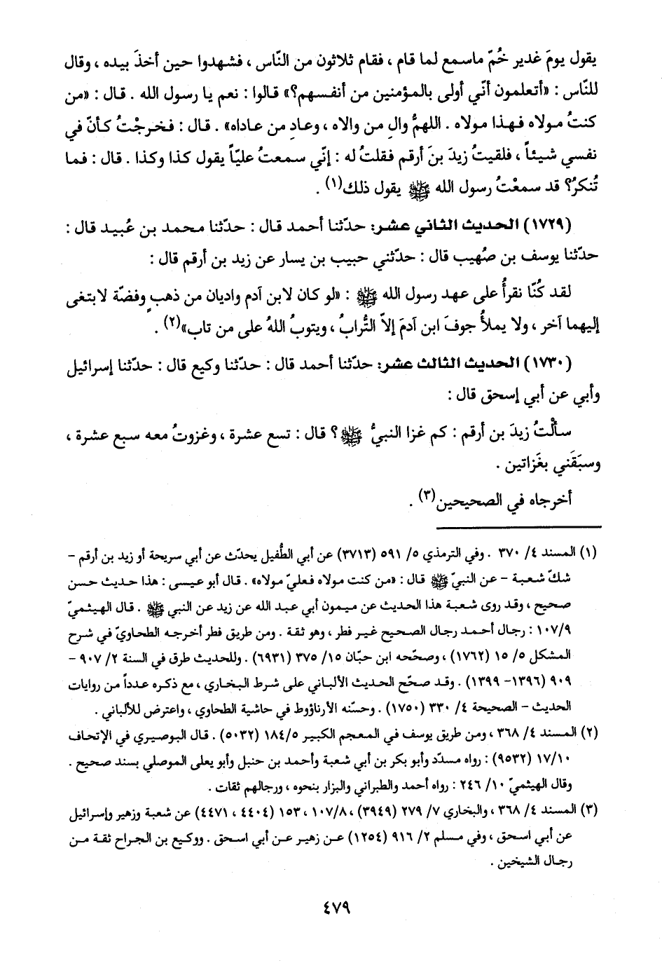 (١) المسند ٤/ ٣٧٠. وفي الترمذي ٥/ ٥٩١ (٣٧١٣) عن أبي الطفيل يحدّث عن أبي صريحة أو زيد بن أرقم -شكّ شعبة- عن النبيّ -صلى اللَّه عليه وسلم- قال: "من كنت مولاه فعلى مولاه". قال أبو عيسى: هذا حديث حسن صحيح، وقد روى شعبة هذا الحديث عن ميمون أبي عبد اللَّه عن زيد عن النبيّ -صلى اللَّه عليه وسلم-. قال الهيثميّ ٩/ ١٠٧: رجال أحمد رجال الصحيح غير فطر، وهو ثقة. ومن طريق فطر أخرجه الطحاويّ في شرح المشكل ٥/ ١٥ (١٧٦٢)، وصحّحه ابن حبّان ١٥/ ٣٧٥ (٦٩٣١). وللحديث طرق في السنة ٢/ ٩٠٧ - ٩٠٩ (١٣٩٦ - ١٣٩٩). وقد صحّح الحديث الألباني على شرط البخاري، مع ذكره عددًا من روايات الحديث - الصحيحة ٤/ ٣٣٠ (١٧٥٠). وحسّنه الأرناؤوط في حاشية الطحاوي، واعترض للألباني.
