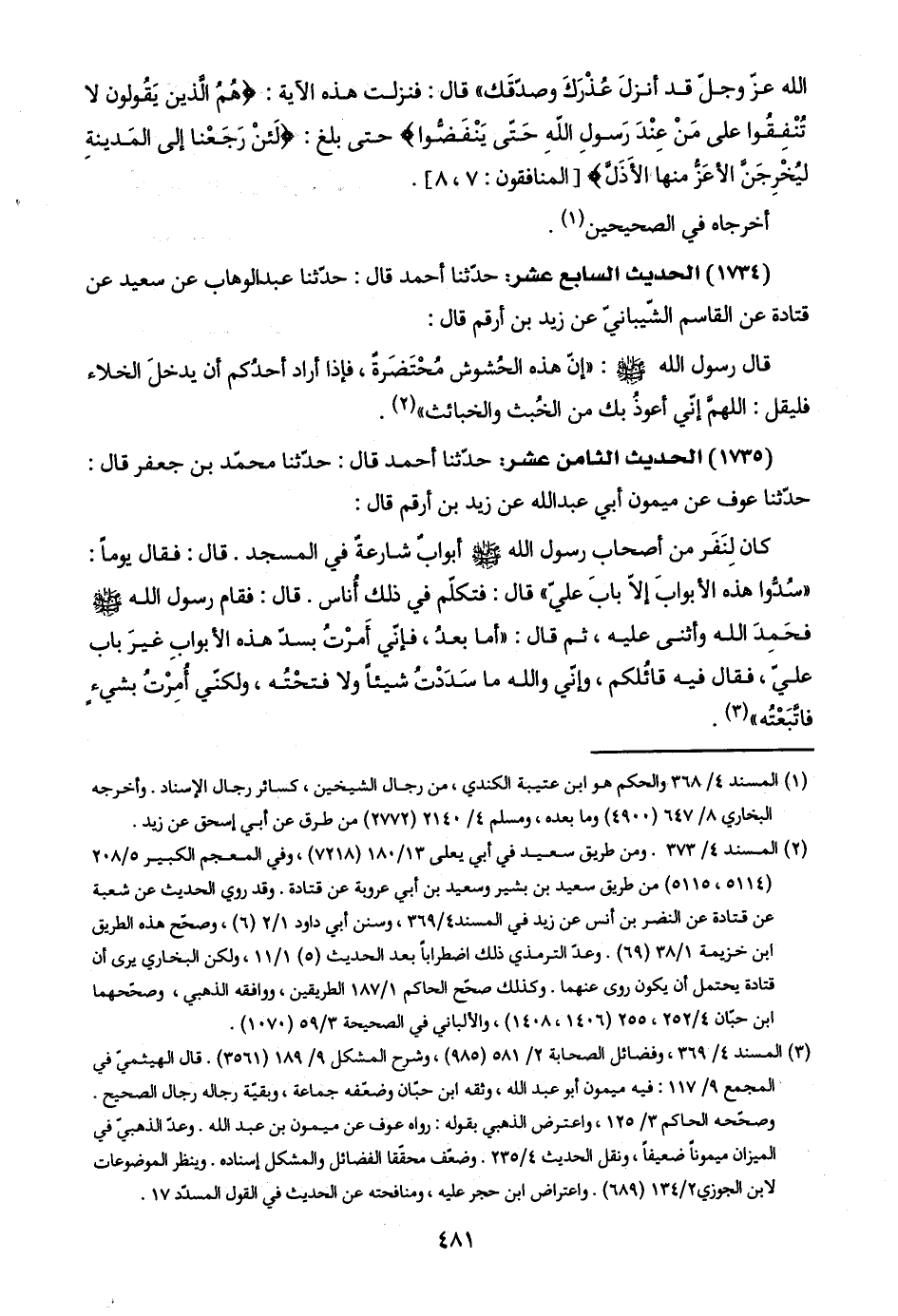 (١٧٣٥) الحديث الثامن عشر: حدّثنا أحمد قال: حدّثنا محمّد بن جعفر قال: حدّثنا عوف عن ميمون أبي عبد اللَّه عن زيد بن أرقم قال: