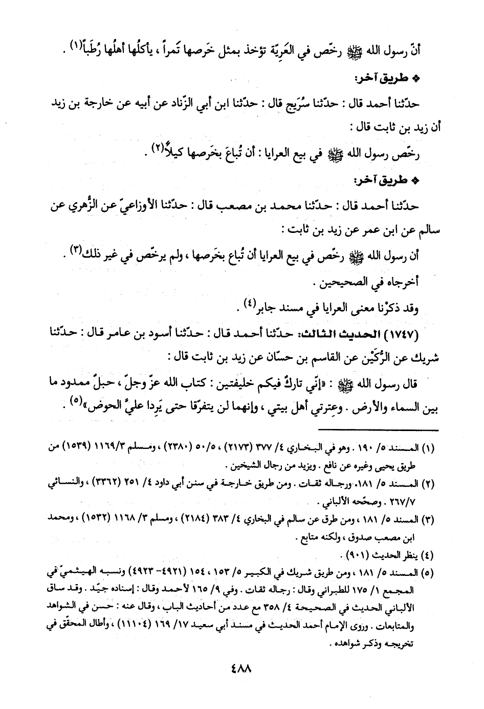 (١٧٤٧) الحديث الثالث: حدّثنا أحمد قال: حدّثنا أسود بن عامر قال: حدّثنا شريك عن الرُّكَيْن عن القاسم بن حسّان عن زيد بن ثابت قال:
