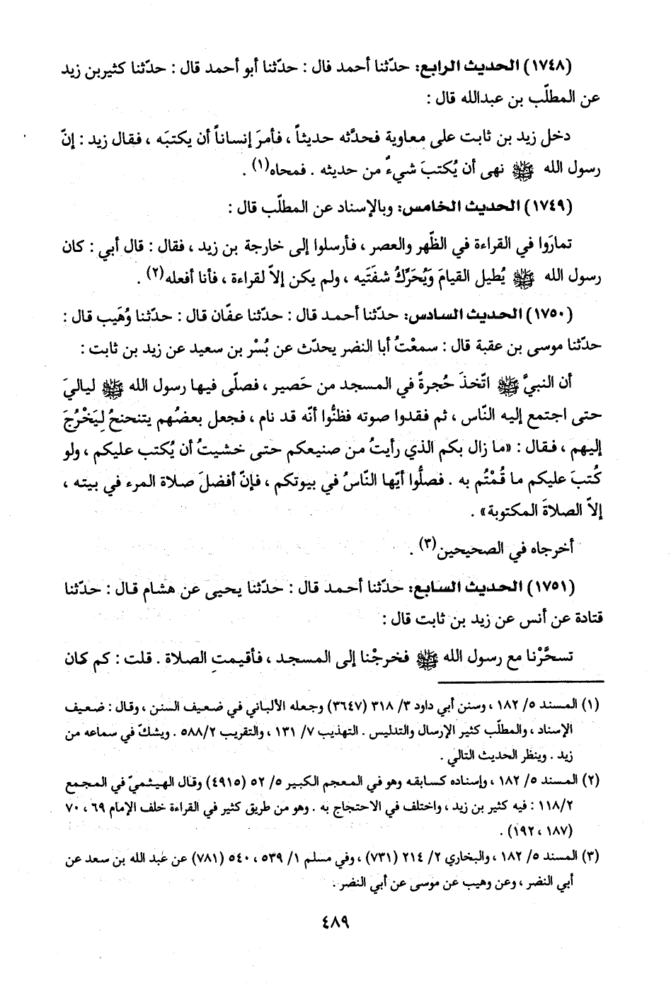(١٧٥٠) الحديث السادس: حدّثنا أحمد قال: حدّثنا عفّان قال: حدّثنا وُهَيب قال: حدّثنا موسى بن عقبة قال: سمعْتُ أبا النضر يحدّث عن بُسْر بن سعيد عن زيد بن ثابت: