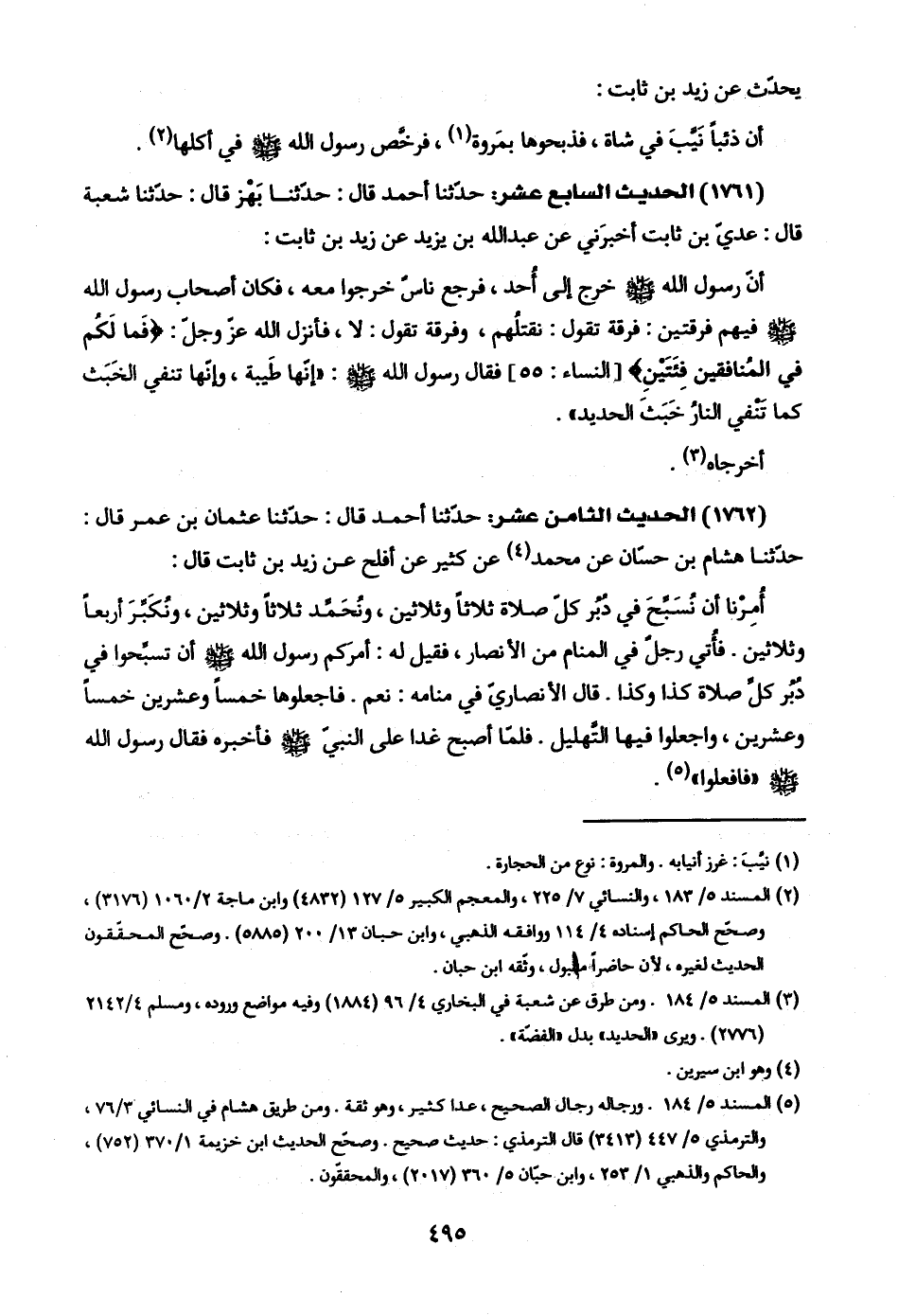 (١٧٦١) الحديث السابع عشر: حدّثنا أحمد قال: حدّثنا بَهْز قال: حدّثنا شعبة قال: عدي بن ثابت أخبرَني عن عبد اللَّه بن يزيد عن زيد بن ثابت: