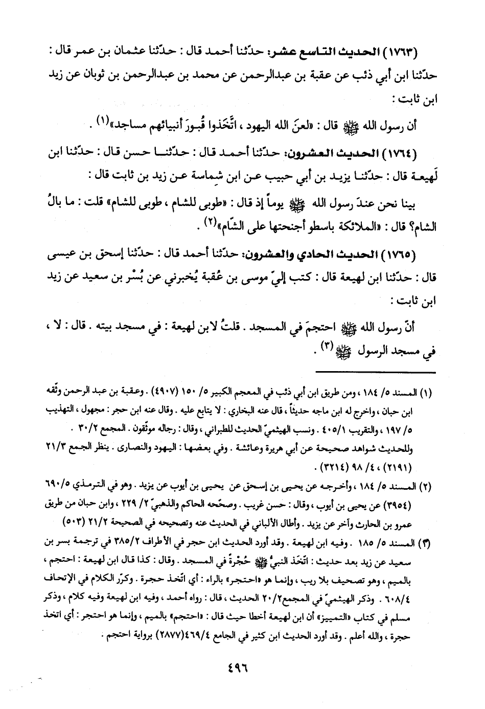 (١٧٦٣) الحديث التاسع عشر: حدّثنا أحمد قال: حدّثنا عثمان بن عمر قال: حدّثنا ابن أبي ذئب عن عقبة بن عبد الرحمن عن محمد بن عبد الرحمن بن ثوبان عن زيد ابن ثابت: