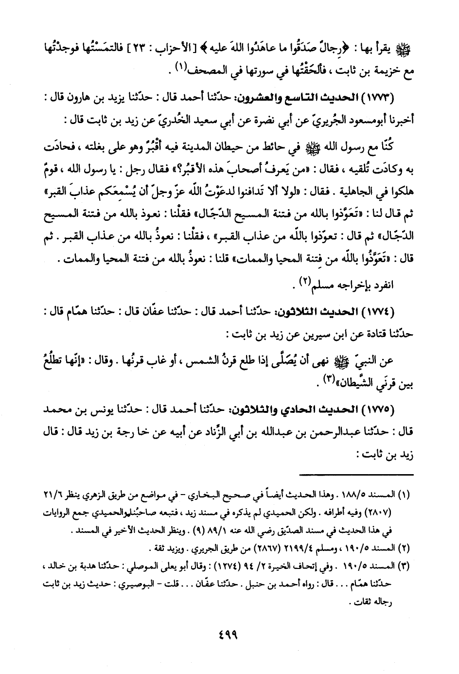 (١٧٧٤) الحديث الثلاثون: حدّثنا أحمد قال: حدّثنا عفّان قال: حدّثنا همّام قال: حدّثنا قتادة عن ابن سيرين عن زيد بن ثابت: