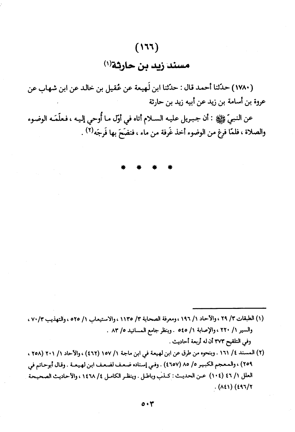 (١٧٨٠) حدّثنا أحمد قال: حدّثنا ابن لَهيعة عن عُقيل بن خالد عن ابن شهاب عن عروة بن أسامة بن زيد عن أبيه زيد بن حارثة: