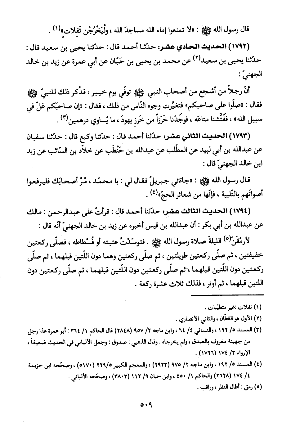 (١٧٩٣) الحديث الثاني عشر: حدّثنا أحمد قال: حدّثنا وكيع قال: حدّثنا سفيان عن عبد اللَّه بن أبي لبيد عن المطلب عن عبد اللَّه بن حَنْطَب عن خلّاد بن السّائب عن زيد ابن خالد الجهنيّ قال: