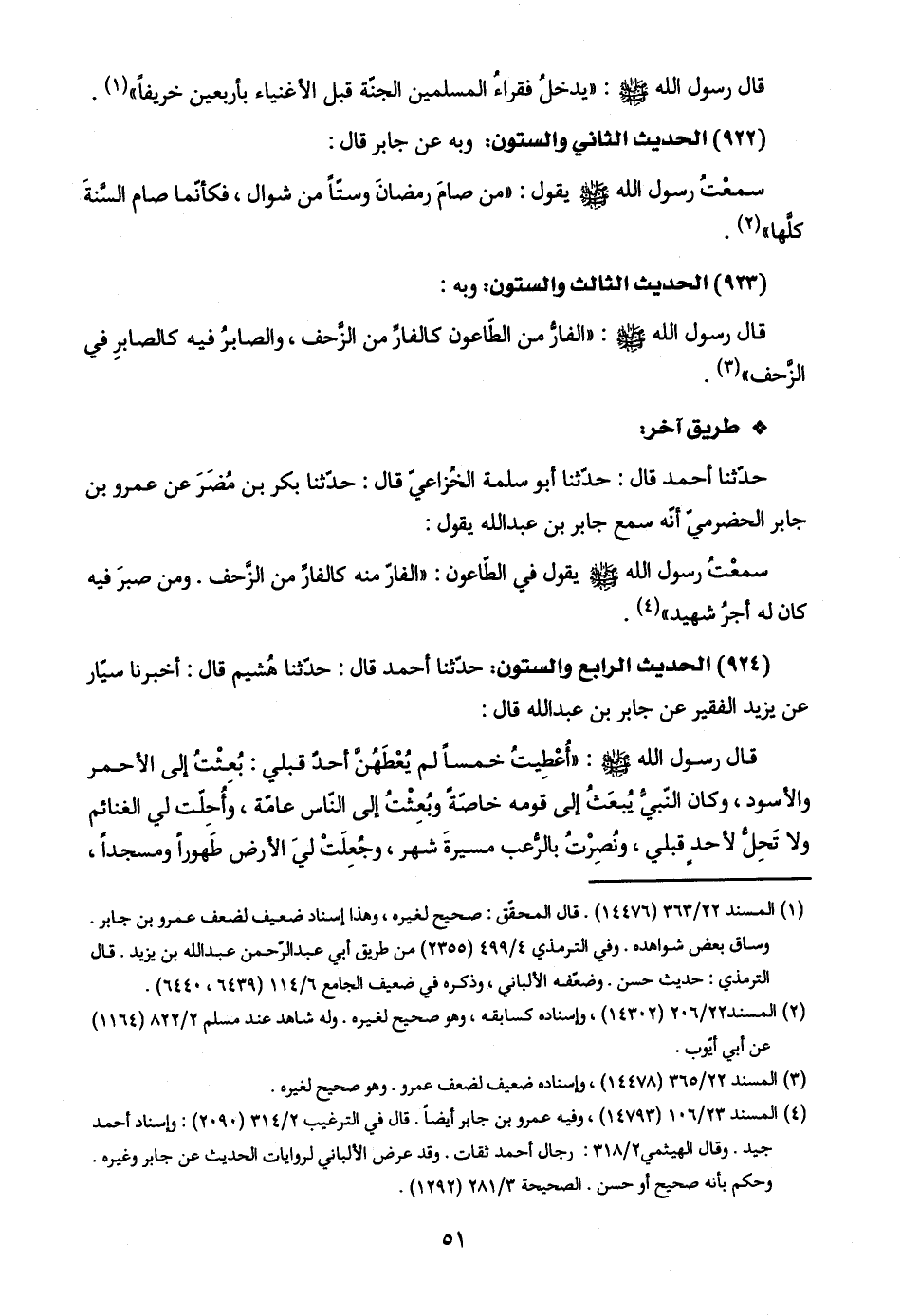 (٤) المسند ٢٣/ ١٠٦ (١٤٧٩٣)، وفيه عمرو بن جابر أيضًا. قال في الترغيب ٤/ ٣١٢ (٢٠٩٠): وإسناد أحمد جيد. وقال الهيثمي ٢/ ٣١٨: رجال أحمد ثقات. وقد عرض الألباني لروايات الحديث عن جابر وغيره. وحكم بأنه صحيح أو حسن. الصحيحة ٣/ ٢٨١ (١٢٩٢).