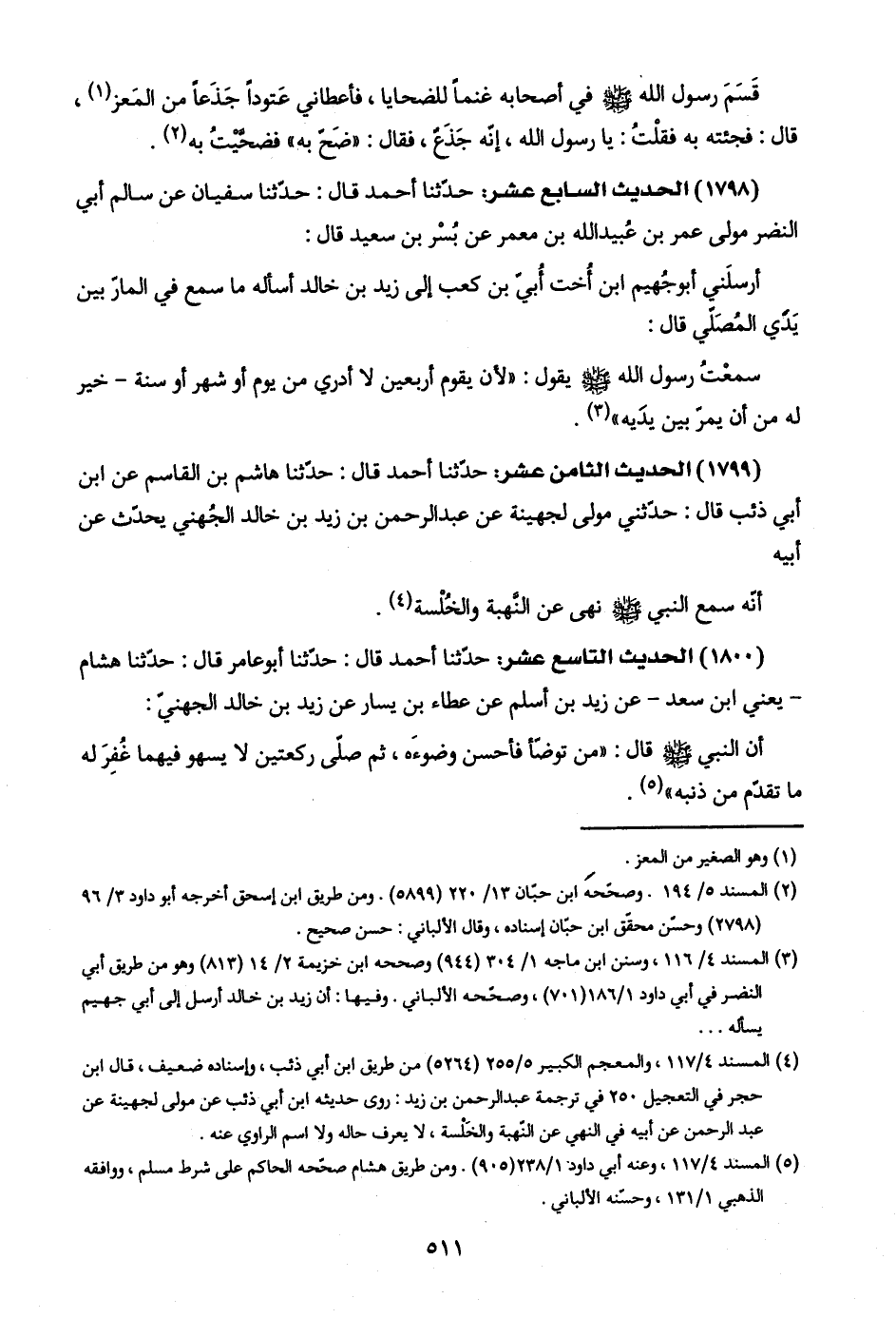 (١٧٩٩) الحديث الثامن عشر: حدّثنا أحمد قال: حدّثنا هاشم بن القاسم عن ابن أبي ذئب قال: حدّثني مولى لجهينة عن عبد الرحمن بن زيد بن خالد الجُهني يحدّث عن أبيه: