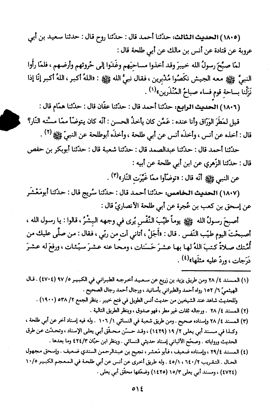 (١٨٠٧) الحديث الخامس: حدّثنا أحمد قال: حدّثنا سُريج قال: حدّثنا أبو مَعْشَر عن إسحق بن كعب بن عُجرة عن أبي طلحة الأنصاريّ قال:
