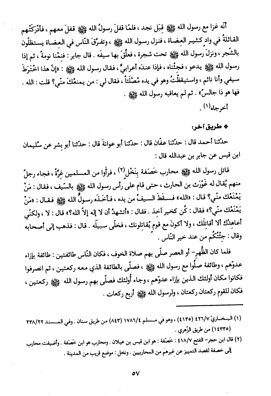 قاتل رسول اللَّه -صلى اللَّه عليه وسلم- محارب خَصَفة بِنَخْلٍ (٢)، فرأَوا من المسلمين غِرَّةً، فجاء رجلٌ منهم يُقال له غَوْرَث بن الحارث، حتى قام على رأس رسول اللَّه -صلى اللَّه عليه وسلم- بالسّيف، فقال: مَنْ يَمْنَعُك منّي؟ قال: "اللَّه" فسقَطَ السيفُ من يده، فأخَذَه رسولُ اللَّه -صلى اللَّه عليه وسلم- فقال: "مَنْ يَمْنَعُك منّي؟ " فقال: كُن كخير آخِذ. فقال: "أتشهدُ أن لا إله إلّا اللَّه؟ " قال: لا، ولكنّي أعاهِدُك ألا أقاتِلَك، ولا أكونَ مع قومٍ يُقاتِلونك، فخلّى سبيلَه. قال: فذهب إلى أصحابه وقال: جِئْتُكُم من عند خير النّاس.