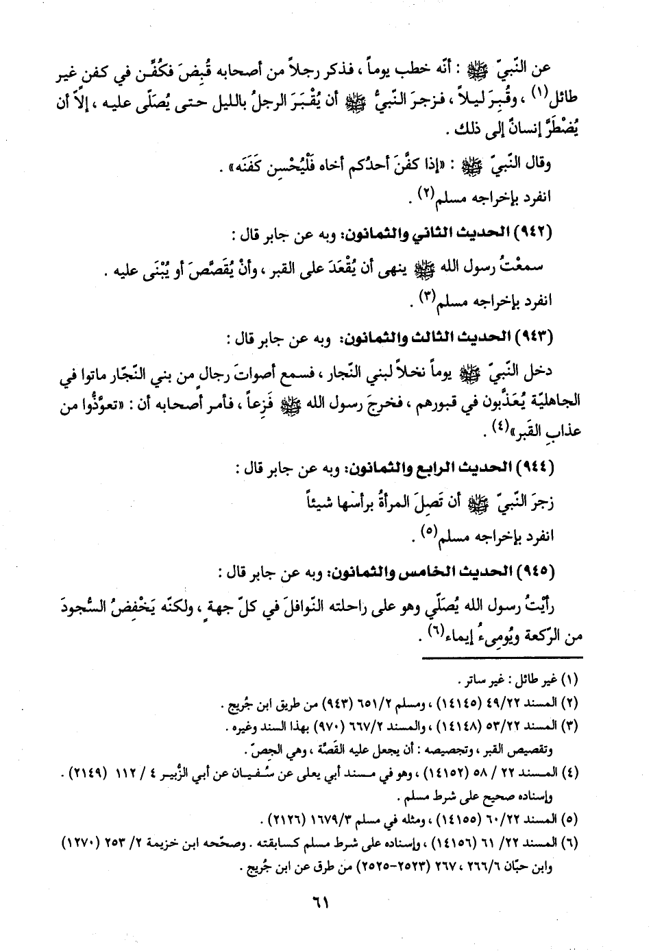 عن النّبيّ -صلى اللَّه عليه وسلم-: أنّه خطب يومًا، فذكر رجلًا من أصحابه قُبِضَ فكُفِّن في كفنٍ غير طائل (١)، وقُبِرَ ليلًا، فزجرَ النّبيُّ -صلى اللَّه عليه وسلم- أن يُقْبَرَ الرجلُ بالليل حتى يُصَلّى عليه، إلّا أن يُضْطَرَّ إنسانٌ إلى ذلك.