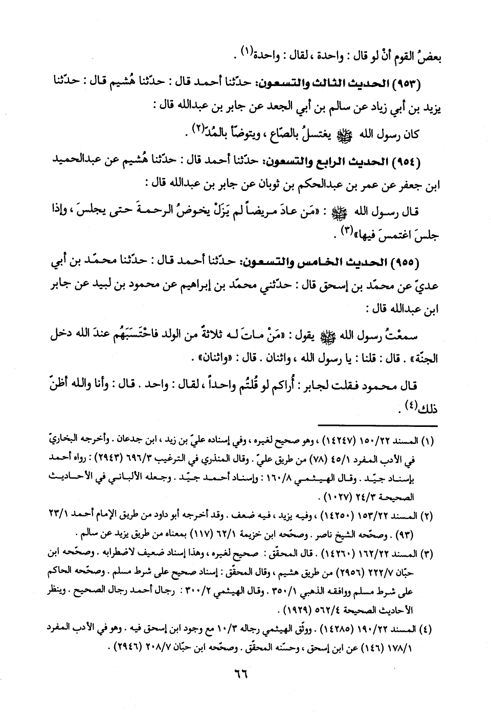 (٩٥٤) الحديث الرابع والتسعون: حدّثنا أحمد قال: حدّثنا هُشيم عن عبد الحميد ابن جعفر عن عمر بن عبد الحكم بن ثوبان عن جابر بن عبد اللَّه قال: