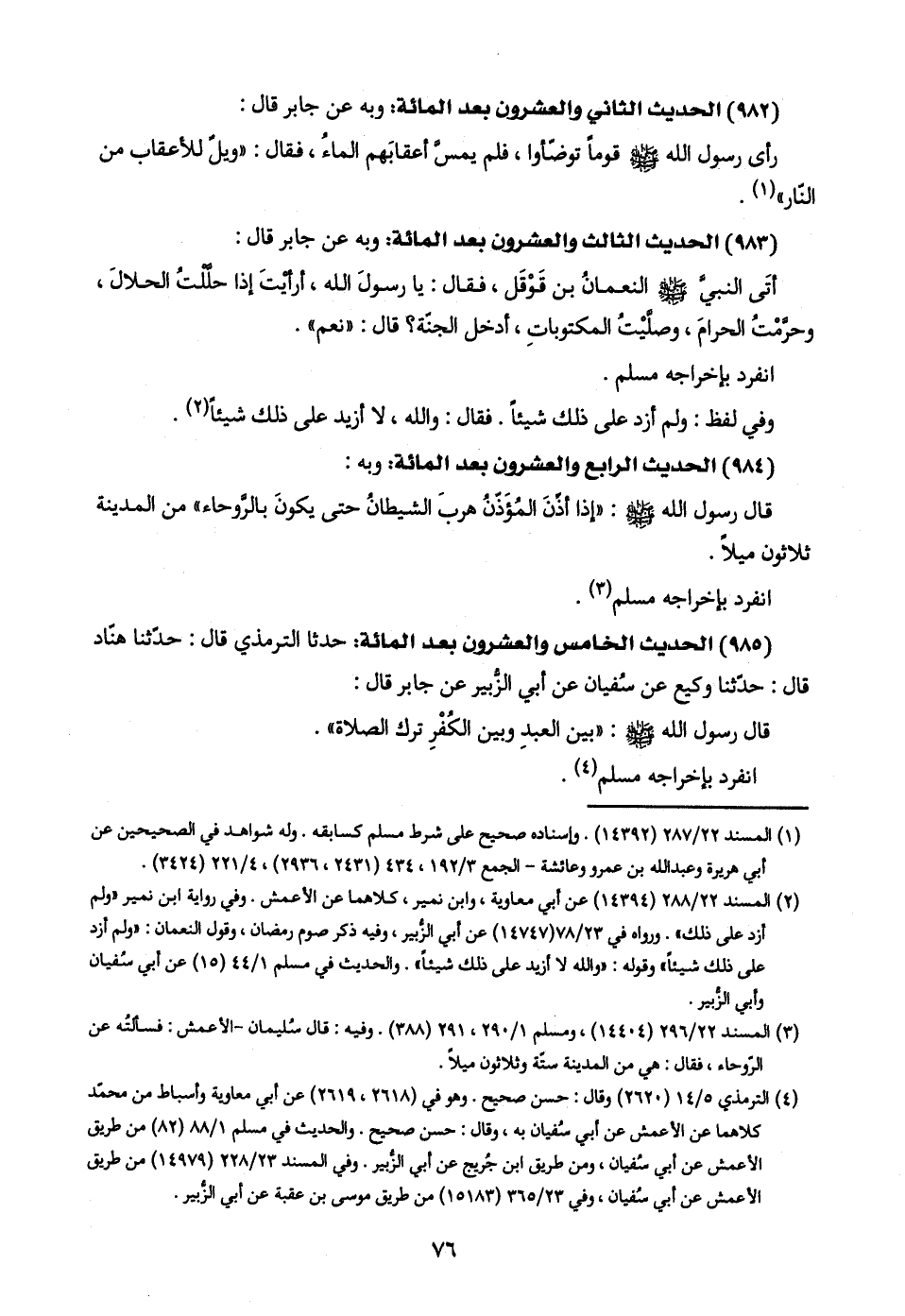 (٢) المسند ٢٢/ ٢٨٨ (١٤٣٩٤) عن أبي معاوية، وابن نمير، كلاهما عن الأعمش. وفي رواية ابن نمير "ولم أزد على ذلك". ورواه في ٢٣/ ٧٨ (١٤٧٤٧) عن أبي الزُّبير، وفيه ذكر صوم رمضان، وقول النعمان: "ولم أزد على ذلك شيئًا" وقوله: "واللَّه لا أزيد على ذلك شيئًا". والحديث في مسلم ١/ ٤٤ (١٥) عن أبي سُفيان وأبي الزُّبير.