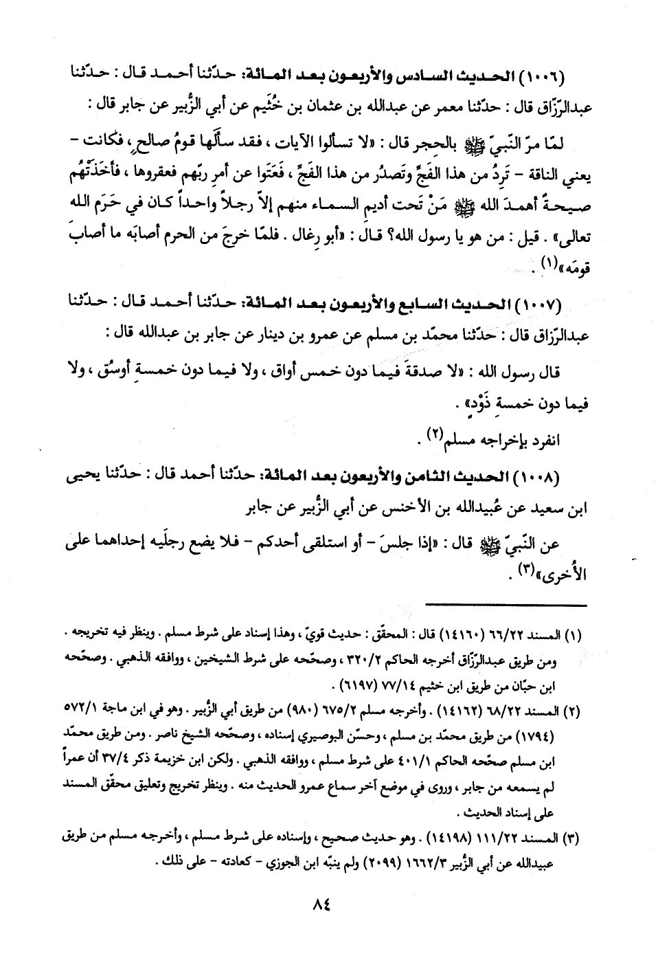(١٠٠٦) الحديث السادس والأربعون بعد المائة: حدّثنا أحمد قال: حدّثنا عبد الرّزّاق قال: حدّثنا معمر عن عبد اللَّه بن عثمان بن خُثَيم عن أبي الزُّبير عن جابر قال: