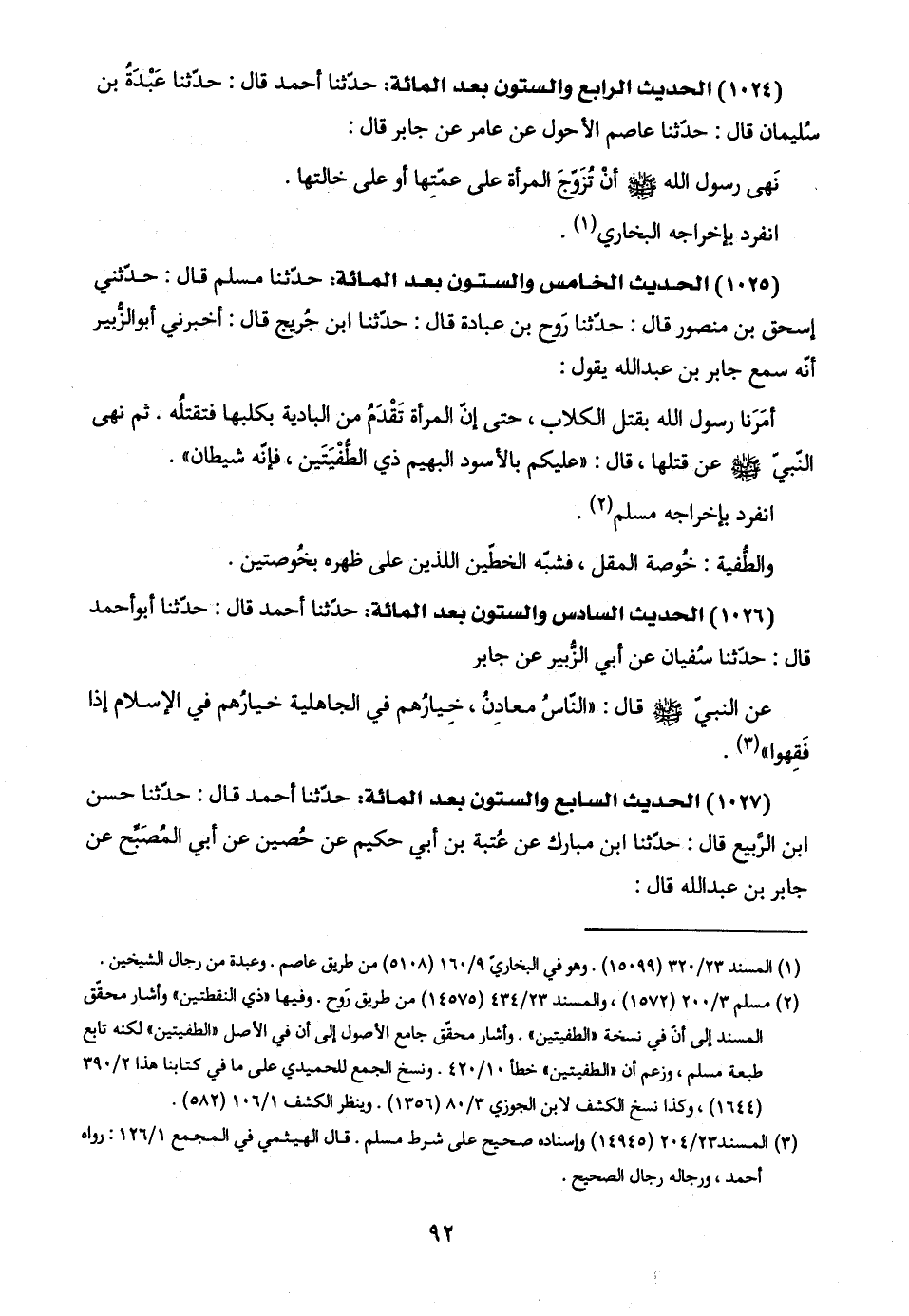 (١٠٢٤) الحديث الرابع والستون بعد المائة: حدّثنا أحمد قال: حدّثنا عَبْدَةُ بن سُليمان قال: حدّثنا عاصم الأحول عن عامر عن جابر قال: