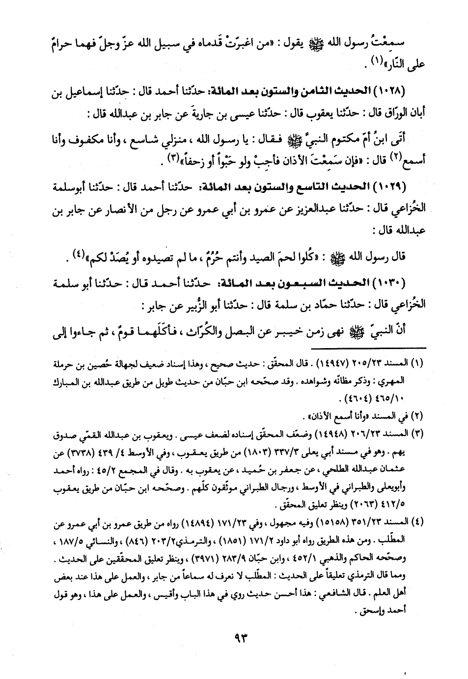 (٤) المسند ٢٣/ ٣٥١ (١٥١٥٨) وفيه مجهول، وفي ٢٣/ ١٧١ (١٤٨٩٤) رواه من طريق عمرو بن أبي عمرو عن المطّلب. ومن هذه الطريق رواه أبو داود ٢/ ١٧١ (١٨٥١)، والترمذي ٣/ ٢٠٢ (٨٤٦)، والنسائي ٥/ ١٨٧، وصحّحه الحاكم والذهبي ١/ ٤٥٢، وابن حبّان ٩/ ٢٨٣ (٣٩٧١)، وينظر تعليق المحقّقين على الحديث. ومما قال الترمذي تعليقًا على الحديث: المطّلب لا نعرف له سماعًا من جابر، والعمل على هذا عند بعض أهل العلم. قال الشافعي: هذا أحسن حديث روي في هذا الباب وأقيس، والعمل على هذا، وهو قول أحمد وإسحق.