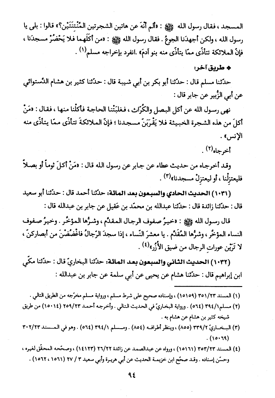 نهى رسول اللَّه عن أكل البصل والكُرّاث، فغلبَتْنا الحاجة فأكلْنا منها، فقال: "مَنْ أكلَ من هذه الشجرة الخبيثة فلا يَقْرَبَنّ مسجدنا؛ فإنّ الملائكةَ تتأذّى ممّا يتأذّى منه الإنس".