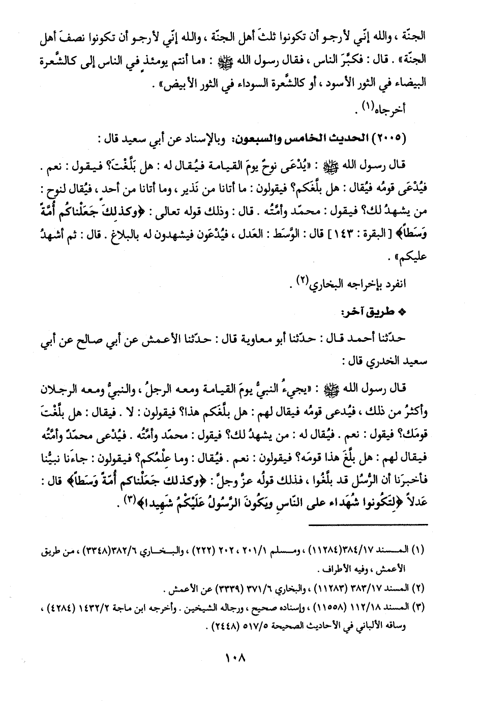 قال رسول اللَّه -صلى اللَّه عليه وسلم-: "يُدْعَى نوحٌ يومَ القيامة فيُقال له: هل بَلَّغْتَ؟ فيقول: نعم. فيُدْعَى قومُه فيُقال: هل بلَّغَكم؟ فيقولون: ما أتانا من نَذير، وما أتانا من أحدٍ، فيُقال لنوح: من يشهدُ لك؟ فيقول: محمّد وأمَّتُه. قال: وذلك قوله تعالى: {وَكَذَلِكَ جَعَلْنَاكُمْ أُمَّةً وَسَطًا} [البقرة: ١٤٣] قال: الوَّسَط: العَدل، فيُدْعَون فيشهدون له بالبلاغ. قال: ثم أشهدُ عليكم".