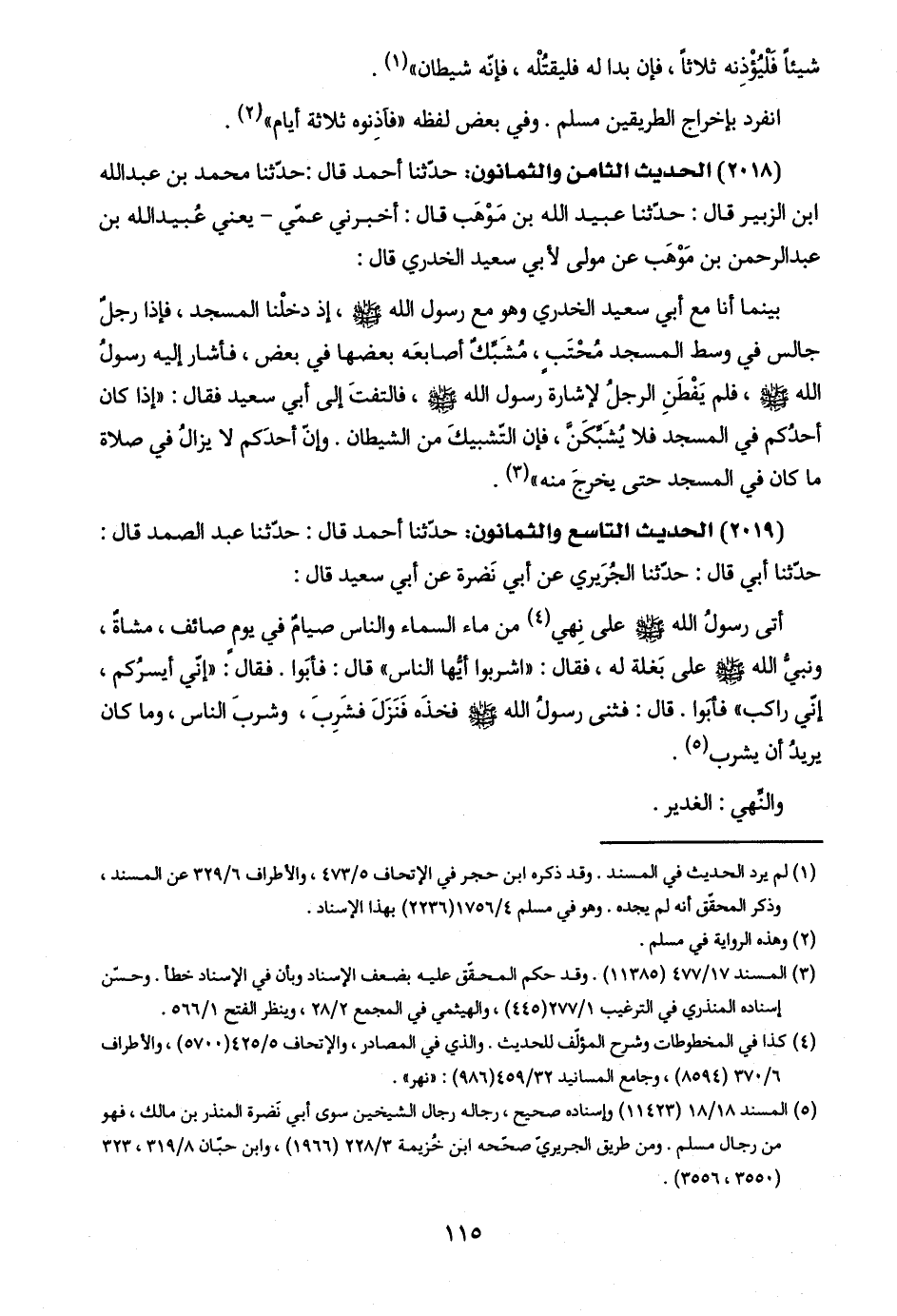 (٢٠١٨) الحديث الثامن والثمانون: حدّثنا أحمد قال: حدّثنا محمد بن عبد اللَّه ابن الزبير قال: حدّثنا عبيد اللَّه بن مَوْهَب قال: أخبرني عمّي - يعني عُبيد اللَّه بن عبد الرحمن بن مَوْهَب عن مولى لأبي سعيد الخدري قال: