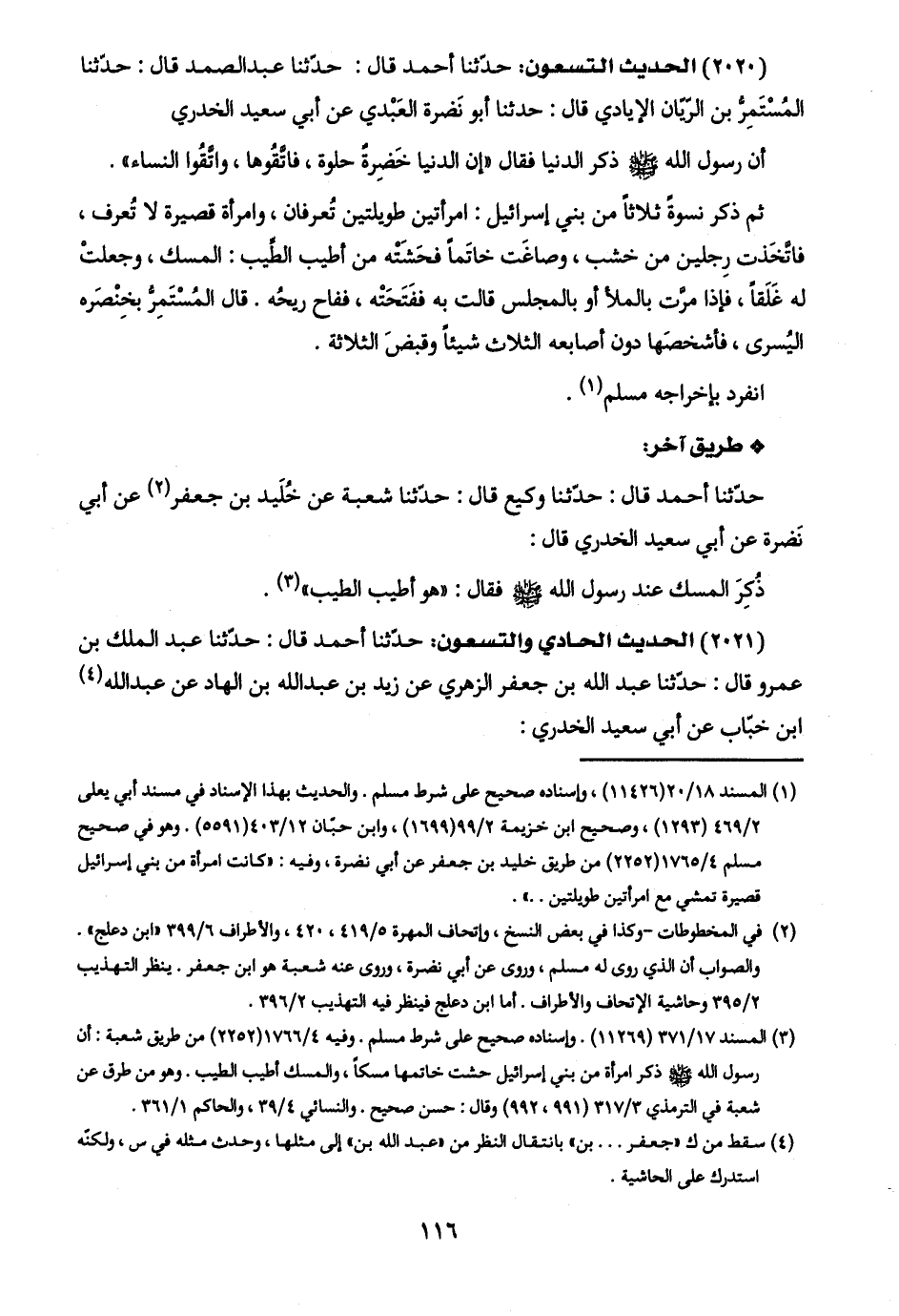 (٣) المسند ١٧/ ٣٧١ (١١٢٦٩). وإسناده صحيح على شرط مسلم. وفيه ٤/ ١٧٦٦ (٢٢٥٢) من طريق شعبة: أن رسول اللَّه -صلى اللَّه عليه وسلم- ذكر امرأة من بني إسرائيل حشت خاتمها مسكًا، والمسك أطيب الطيب. وهو من طرق عن شعبة في الترمذي ٣/ ٣١٧ (٩٩١، ٩٩٢) وقال: حسن صحيح. والنسائي ٤/ ٣٩، والحاكم ١/ ٣٦١.