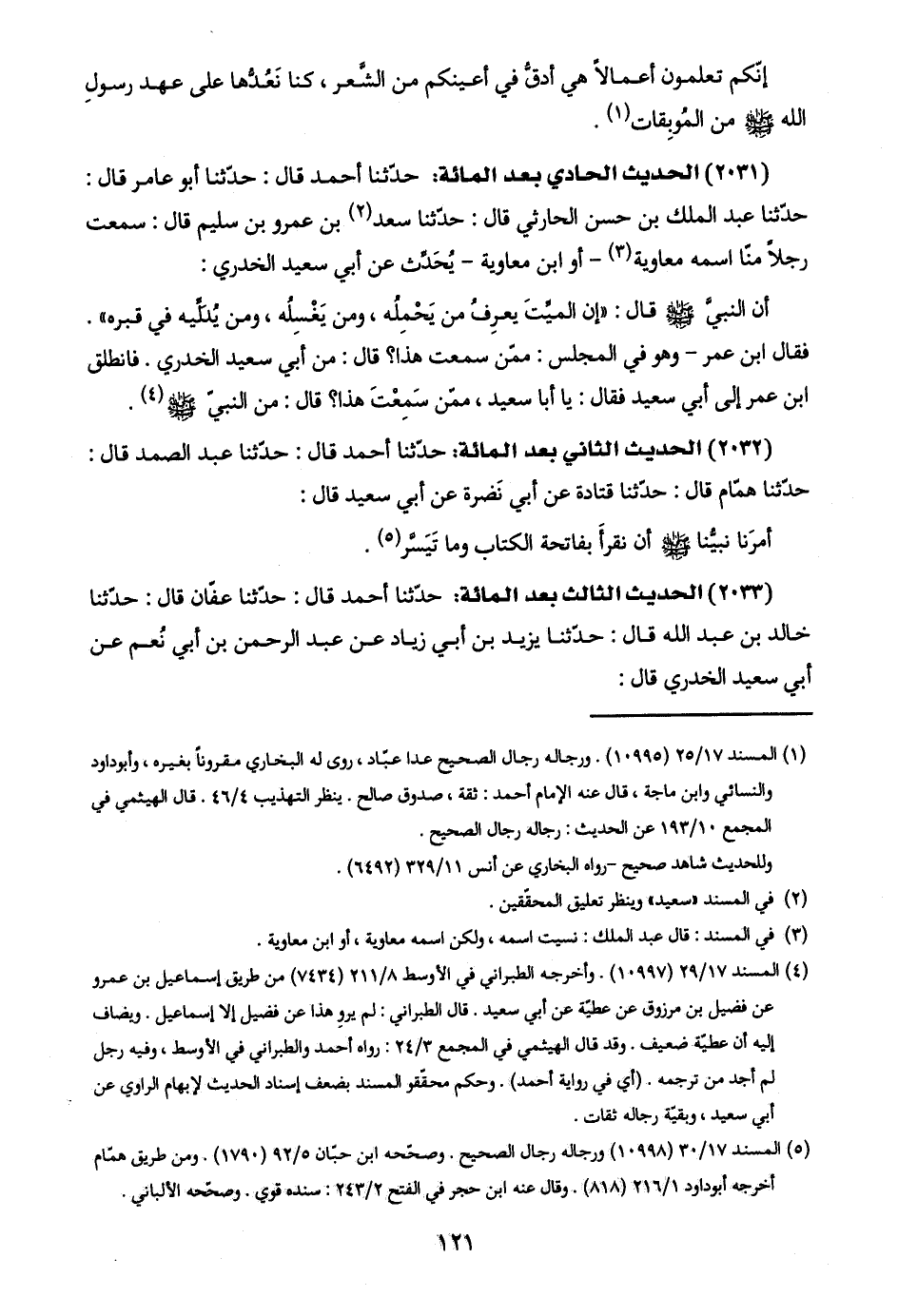 (٢٠٣١) الحديث الحادي بعد المائة: حدّثنا أحمد قال: حدّثنا أبو عامر قال: حدّثنا عبد الملك بن حسن الحارثي قال: حدّثنا سعد (٢) بن عمرو بن سليم قال: سمعت رجلًا منّا اسمه معاوية (٣) -أو ابن معاوية- يُحَدِّث عن أبي سعيد الخدري: