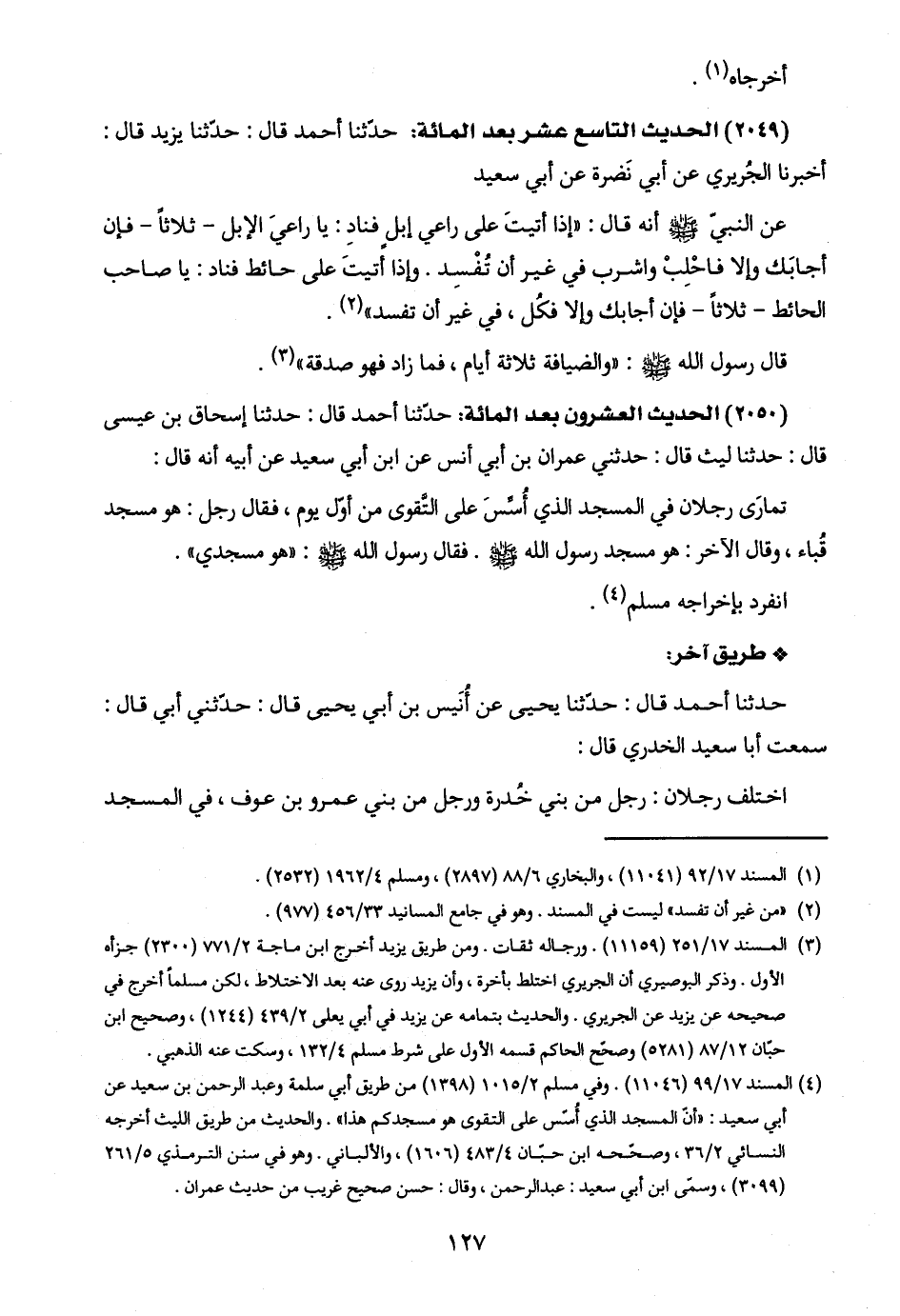 (٤) المسند ١٧/ ٩٩ (١١٠٤٦). وفي مسلم ٢/ ١٠١٥ (١٣٩٨) من طريق أبي سلمة وعبد الرحمن بن سعيد عن أبي سعيد: "أنّ المسجد الذي أُسِّس على التقوى هو مسجدكم هذا". والحديث من طريق الليث أخرجه النسائي ٢/ ٣٦، وصحّحه ابن حبّان ٤/ ٤٨٣ (١٦٠٦)، والألباني. وهو في سنن الترمذي ٥/ ٢٦١ (٣٠٩٩)، وسمّى ابن أبي سعيد: عبد الرحمن، وقال: حسن صحيح غريب من حديث عمران.