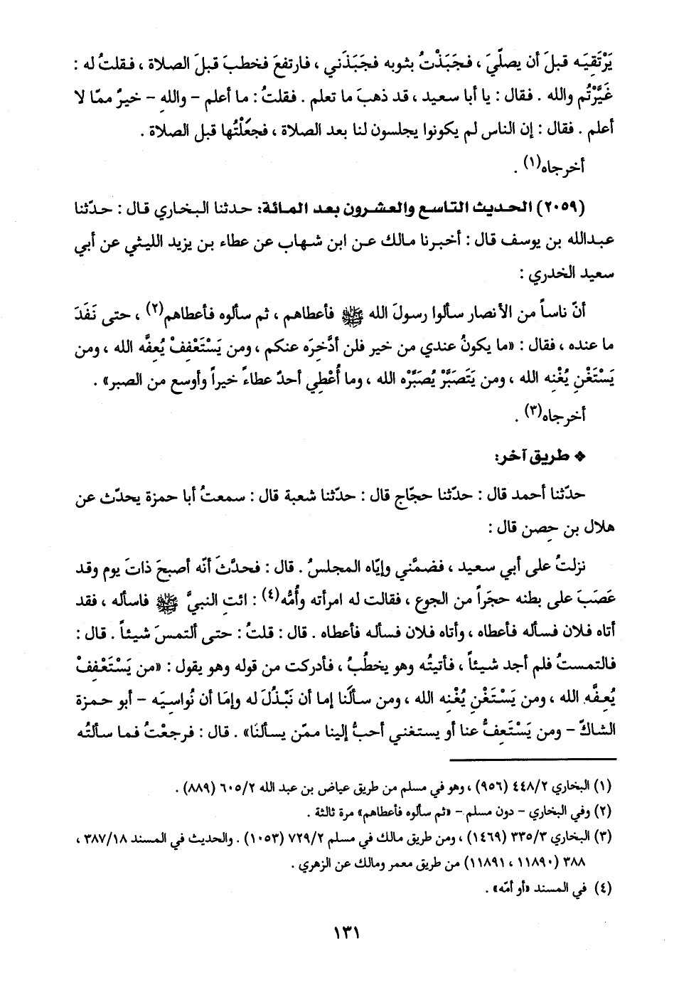 نزلتُ على أبي سعيد، فضمَّني وإيّاه المجلسُ. قال: فحدَّثَ أنّه أصبحَ ذاتَ يوم وقد عَصَبَ على بطنه حجَرًا من الجوع، فقالت له امرأته وأُمُّه (٤): ائتِ النبيَّ -صلى اللَّه عليه وسلم- فاسأله، فقد أتاه فلان فسأله فأعطاه، وأتاه فلان فسأله فأعطاه. قال: قلتُ: حتى ألتمسَ شيئًا. قال: فالتمستُ فلم أجد شيئًا، فأتيتُه وهو يخطُبُ، فأدركت من قوله وهو يقول: "من يَسْتَعْفِفْ يُعِفَّه اللَّه، ومن يَسْتَغْنِ يُغْنِه اللَّه، ومن سألَنا إما أن نَبْذُلَ له وإمَا أن نُواسِيَه -أبو حمزة الشاكّ- ومن يَسْتَعِفُّ عنا أو يستغني أحبُّ إلينا ممّن يسألنَا". قال: فرجعْتُ فما سألتُه