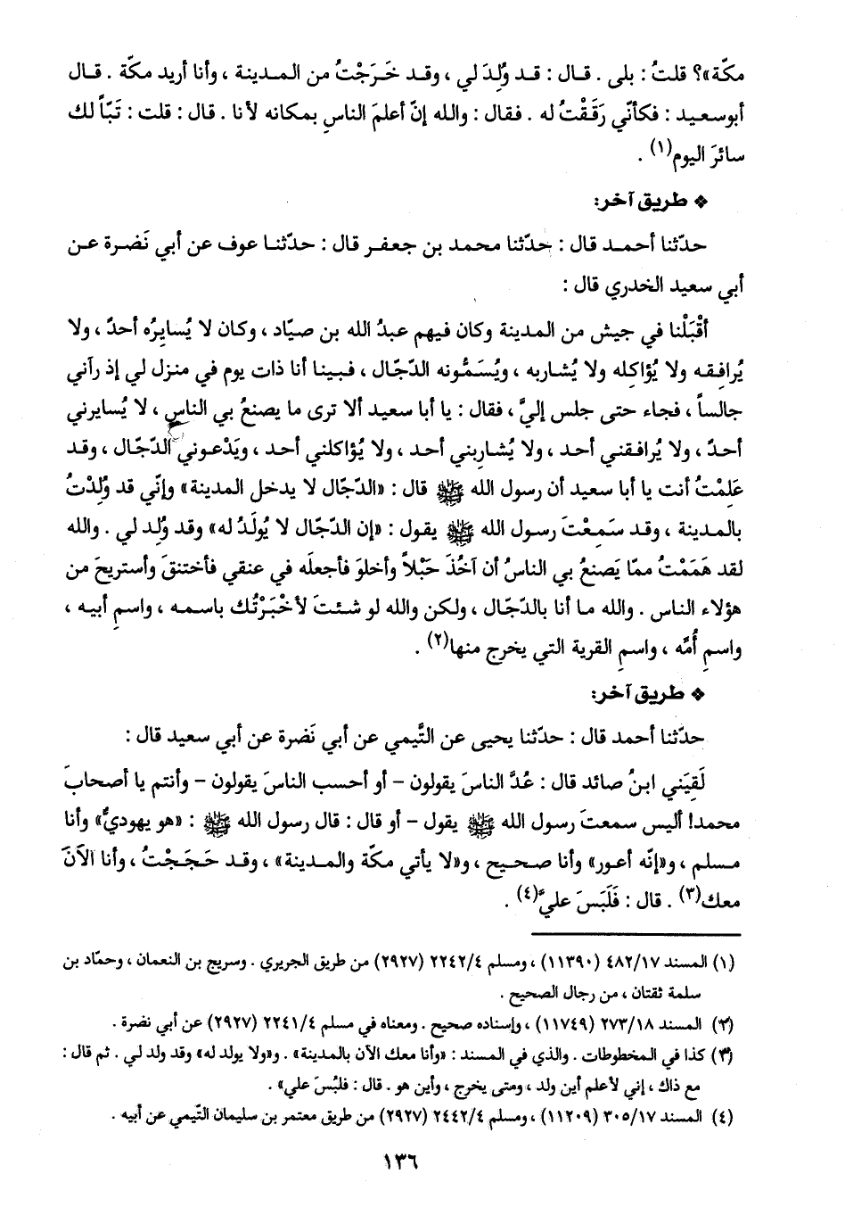 أقْبَلْنا في جيش من المدينة وكان فيهم عبدُ اللَّه بن صيّاد، وكان لا يُسايِرُه أحدٌ، ولا يُرافِقه ولا يُؤاكِله ولا يُشاربه، ويُسَمُّونه الدّجّال، فبينا أنا ذات يوم في منزل لي إذ رآني جالسًا، فجاء حتى جلس إليَّ، فقال: يا أبا سعيد ألا ترى ما يصنعُ بي النّاس، لا يُسايرني أحدٌ، ولا يُرافقني أحد، ولا يُشارِبني أحد، ولا يُؤاكلني أحد، ويَدْعوني الدّجّال، وقد عَلِمْتُ أنت يا أبا سعيد أن رسول اللَّه -صلى اللَّه عليه وسلم- قال: "الدّجّال لا يدخل المدينة" وإنّي قد وُلِدْتُ بالمدينة، وقد سَمِعْتَ رسول اللَّه -صلى اللَّه عليه وسلم- يقول: "إنّ الدّجّال لا يُولَدُ له" وقد وُلِد لي. واللَّه لقد هَمَمْتُ ممّا يَصنعُ بي الناسُ أن آخُذَ حَبْلًا وأخلوَ فأجعلَه في عنقي فأختنقَ وأستريحَ من هؤلاء النّاس. واللَّه ما أنا بالدّجّال، ولكن واللَّه لو شئتَ لأخْبَرْتك باسمه، واسمِ أبيه، واسمِ أُمِّه، واسمِ القرية التي يخرج منها (٢).
