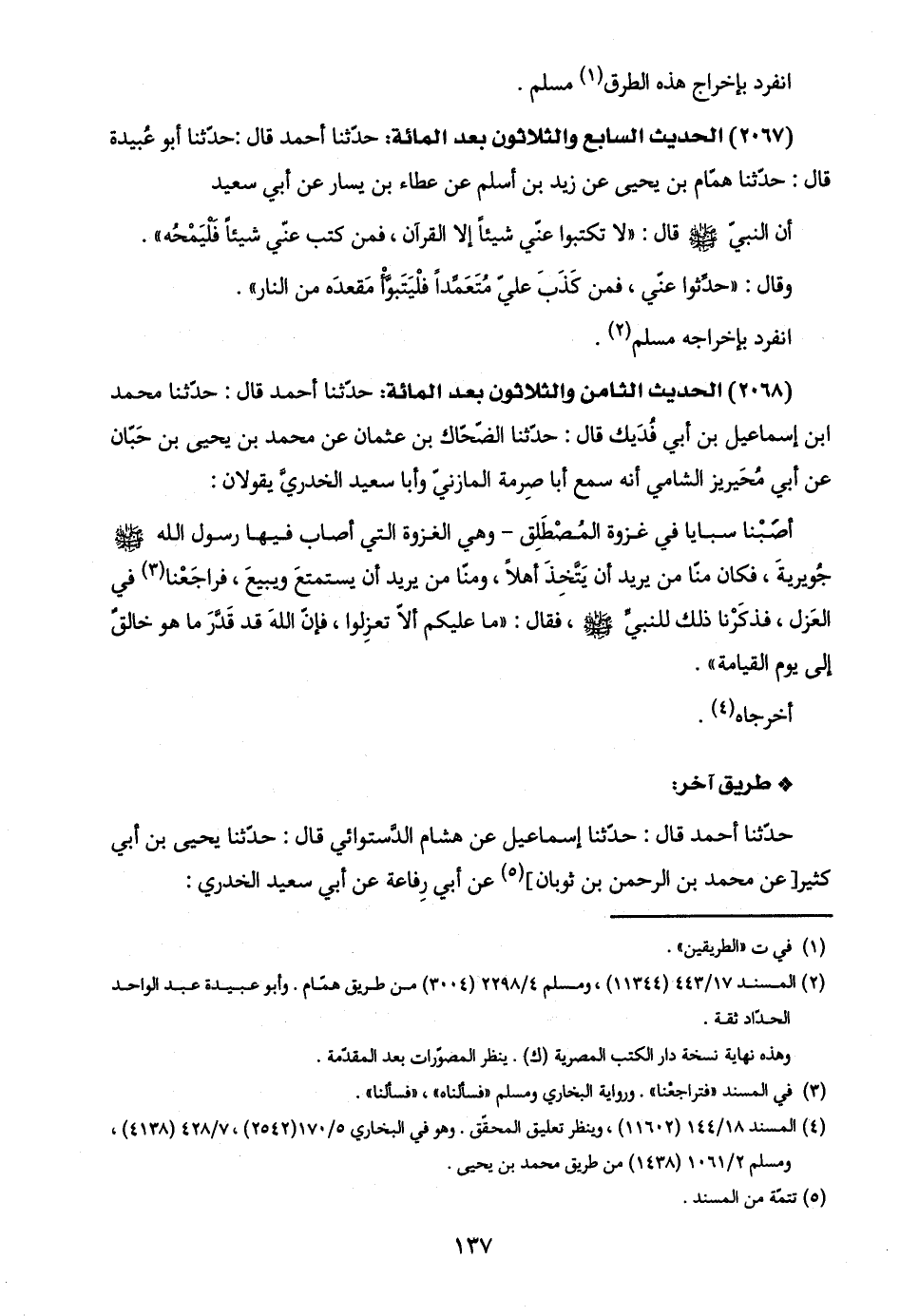 (٢٠٦٧) الحديث السابع والثلاثون بعد المائة: حدّثنا أحمد قال: حدّثنا أبو عُبيدة قال: حدّثنا همّام بن يحيى عن زيد بن أسلم عن عطاء بن يسار عن أبي سعيد: