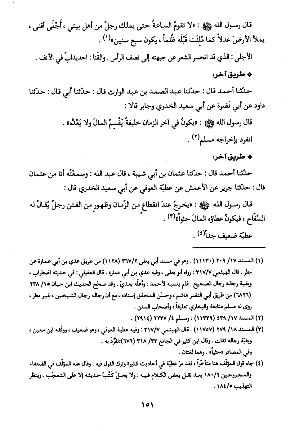 قال رسول اللَّه -صلى اللَّه عليه وسلم-: "لا تقومُ الساعةُ حتى يملك رجلٌ من أهل بيتي، أَجْلَى أقنى، يملأ الأرضَ عدلًا كما مُلِئَت قَبْلَه ظُلمًا، يكون سبع سنين" (١).