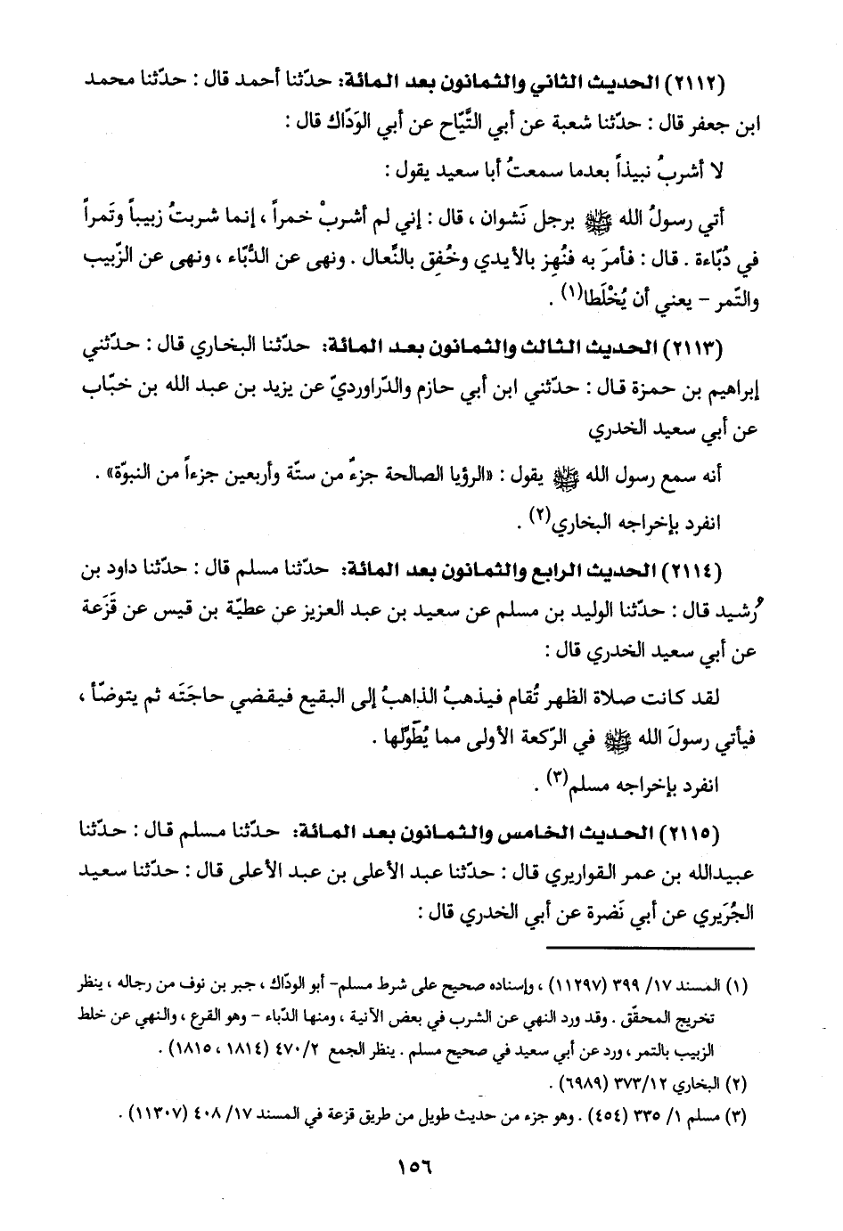 (٢١١٤) الحديث الرابع والثمانون بعد المائة: حدّثنا مسلم قال: حدّثنا داود بن رُشيد قال: حدّثنا الوليد بن مسلم عن سعيد بن عبد العزيز عن عطيّة بن قيس عن قَزَعة عن أبي سعيد الخدري قال: