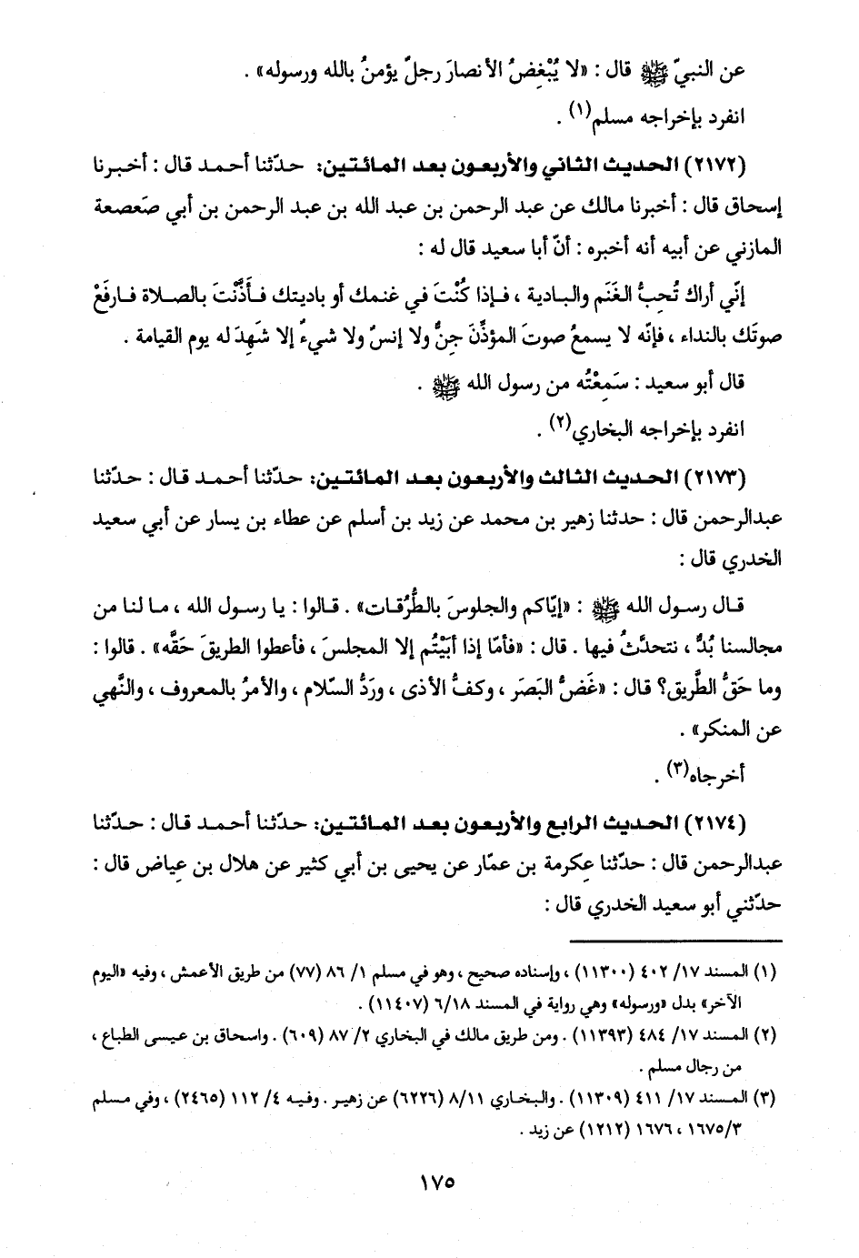 (٢١٧٢) الحديث الثاني والأربعون بعد المائتين: حدّثنا أحمد قال: أخبرنا إسحاق قال: أخبرنا مالك عن عبد الرحمن بن عبد اللَّه بن عبد الرحمن بن أبي صَعصعة المازني عن أبيه أنّه أخبره: أنّ أبا سعيد قال له: