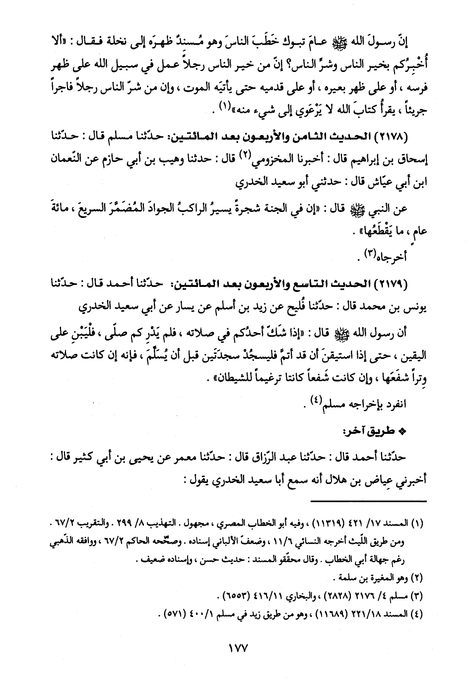 (٢١٧٩) الحديث التاسع والأربعون بعد المائتين: حدّثنا أحمد قال: حدّثنا يونس بن محمد قال: حدّثنا فُليح عن زيد بن أسلم عن يسار عن أبي سعيد الخدري: