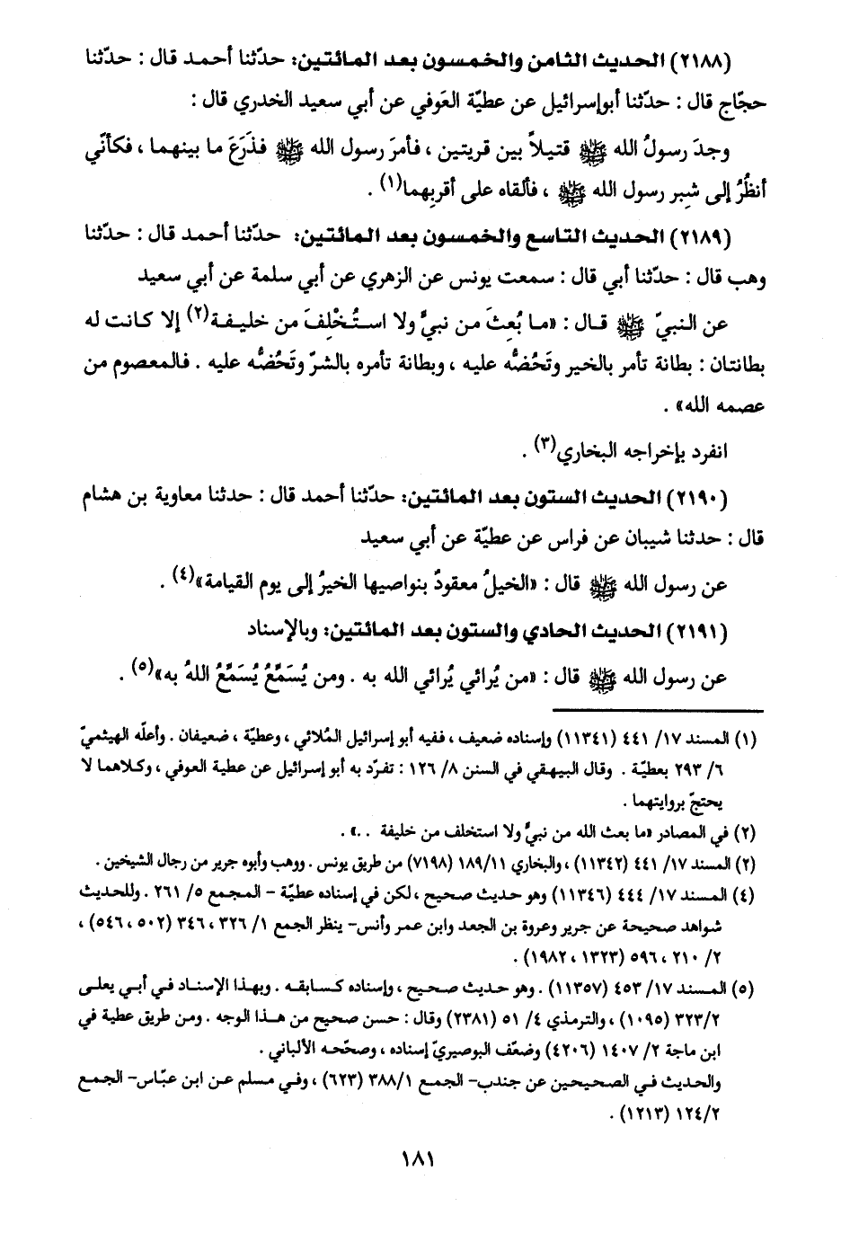 (٢١٩٠) الحديث الستون بعد المائتين: حدّثنا أحمد قال: حدّثنا معاوية بن هشام قال: حدّثنا شيبان عن فراس عن عطيّة عن أبي سعيد: