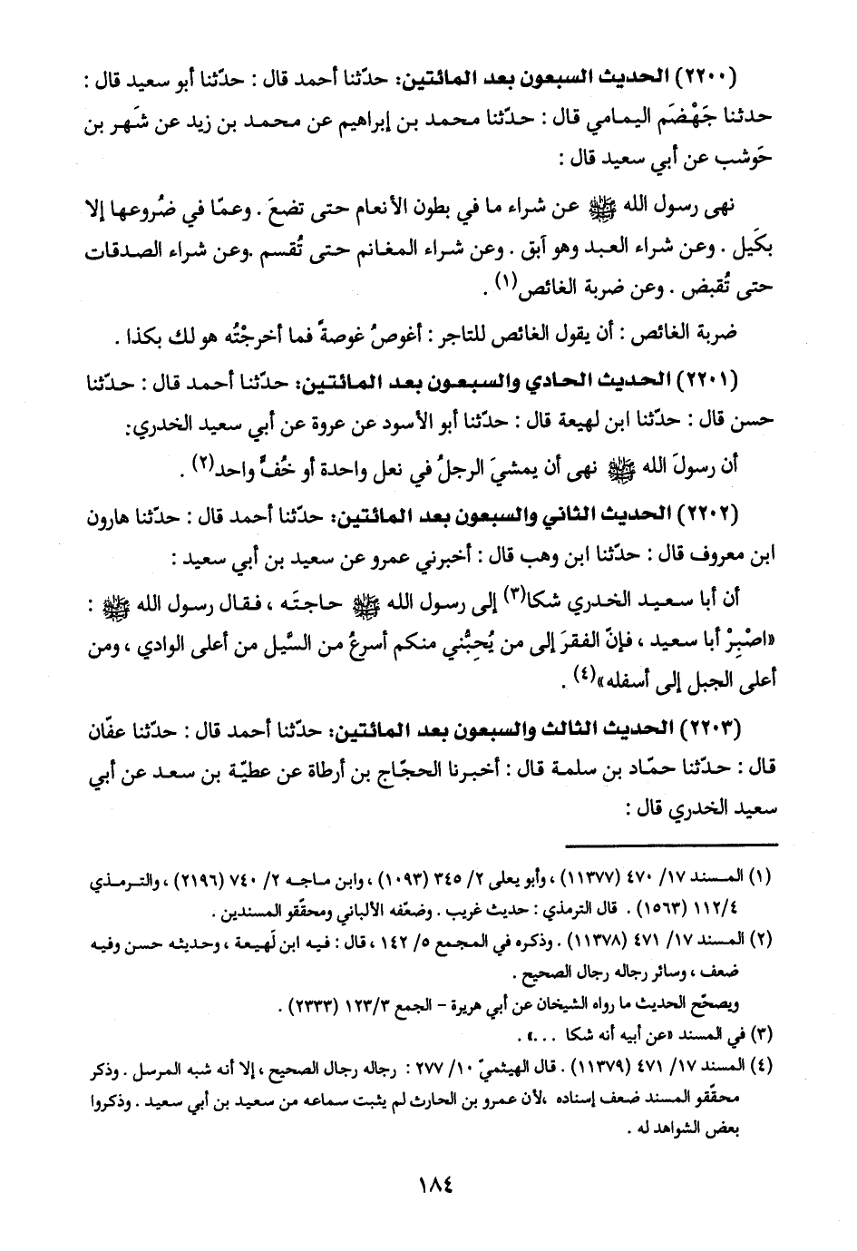 (٢٢٠٣) الحديث الثالث والسبعون بعد المائتين: حدّثنا أحمد قال: حدّثنا عفّان قال: حدّثنا حمّاد بن سلمة قال: أخبرنا الحجّاج بن أرطاة عن عطيّة بن سعد عن أبي سعيد الخدري قال: