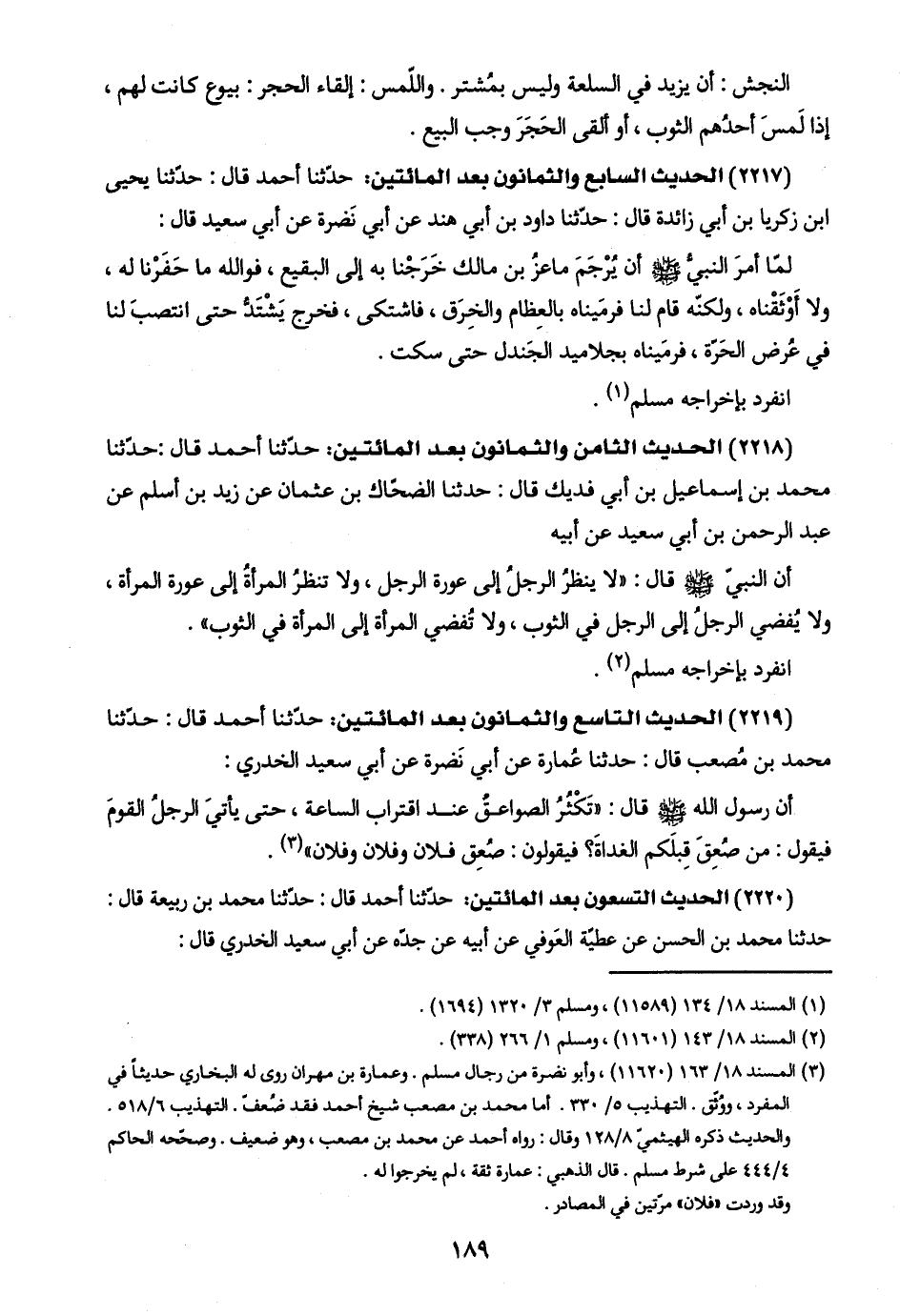 (٢٢١٩) الحديث التاسع والثمانون بعد المائتين: حدّثنا أحمد قال: حدّثنا محمد بن مُصعب قال: حدّثنا عُمارة عن أبي نَضرة عن أبي سعيد الخدري: