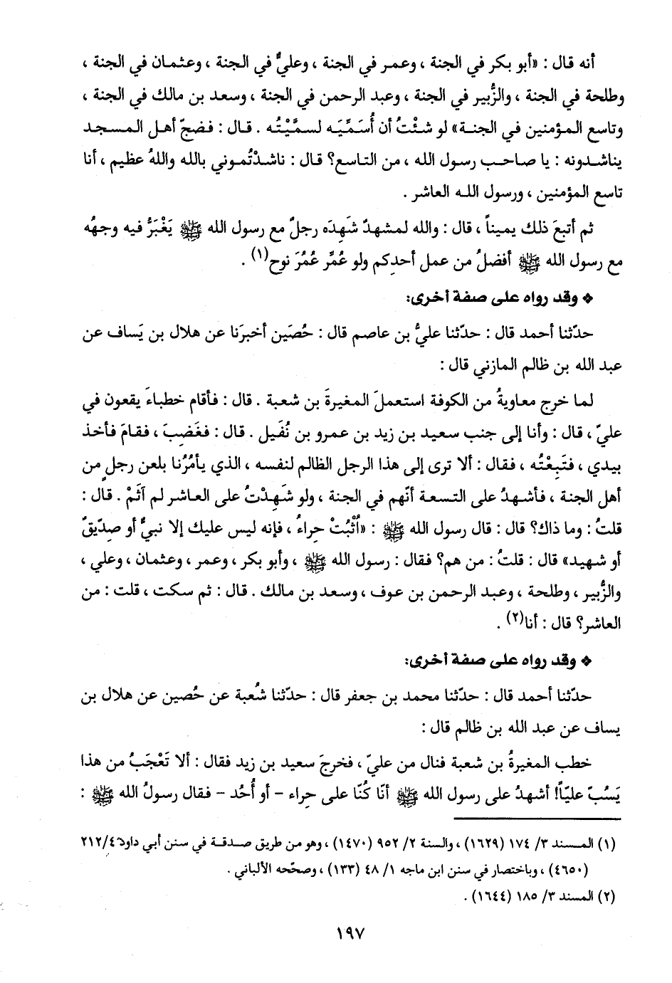 أنّه قال: "أبو بكر في الجنّة، وعمر في الجنّة، وعليٌّ في الجنّة، وعثمان في الجنّة، وطلحة في الجنّة، والزُّبير في الجنّة، وعبد الرحمن في الجنّة، وسعد بن مالك في الجنّة، وتاسع المؤمنين في الجنّة" لو شئْث أن أُسَمِّيَه لسمَّيْته. قال: فضجّ أهل المسجد يناشدونه: يا صاحب رسول اللَّه، من التاسع؟ قال: ناشدْتُموني باللَّه واللَّهُ عظيم، أنا تاسع المؤمنين، ورسول اللَّه العاشر.