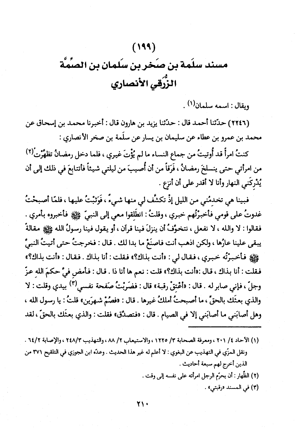(٢٢٤٦) حدّثنا أحمد قال: حدّثنا يزيد بن هارون قال: أخبرنا محمد بن إسحاق عن محمد بن عمرو بن عطاء عن سليمان بن يسار عن سلَمة بن صخر الأنصاري: