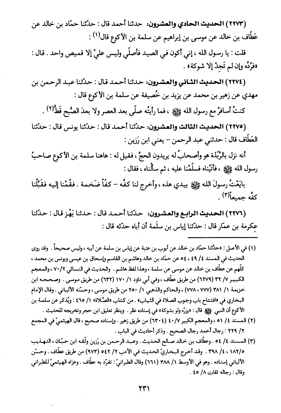 (٢٢٧٣) الحديث الحادي والعشرون: حدّثنا أحمد قال: حدّثنا حمّاد بن خالد عن عَطّاف بن خالد عن موسى بن إبراهيم عن سلمة بن الأكوع قال (١):