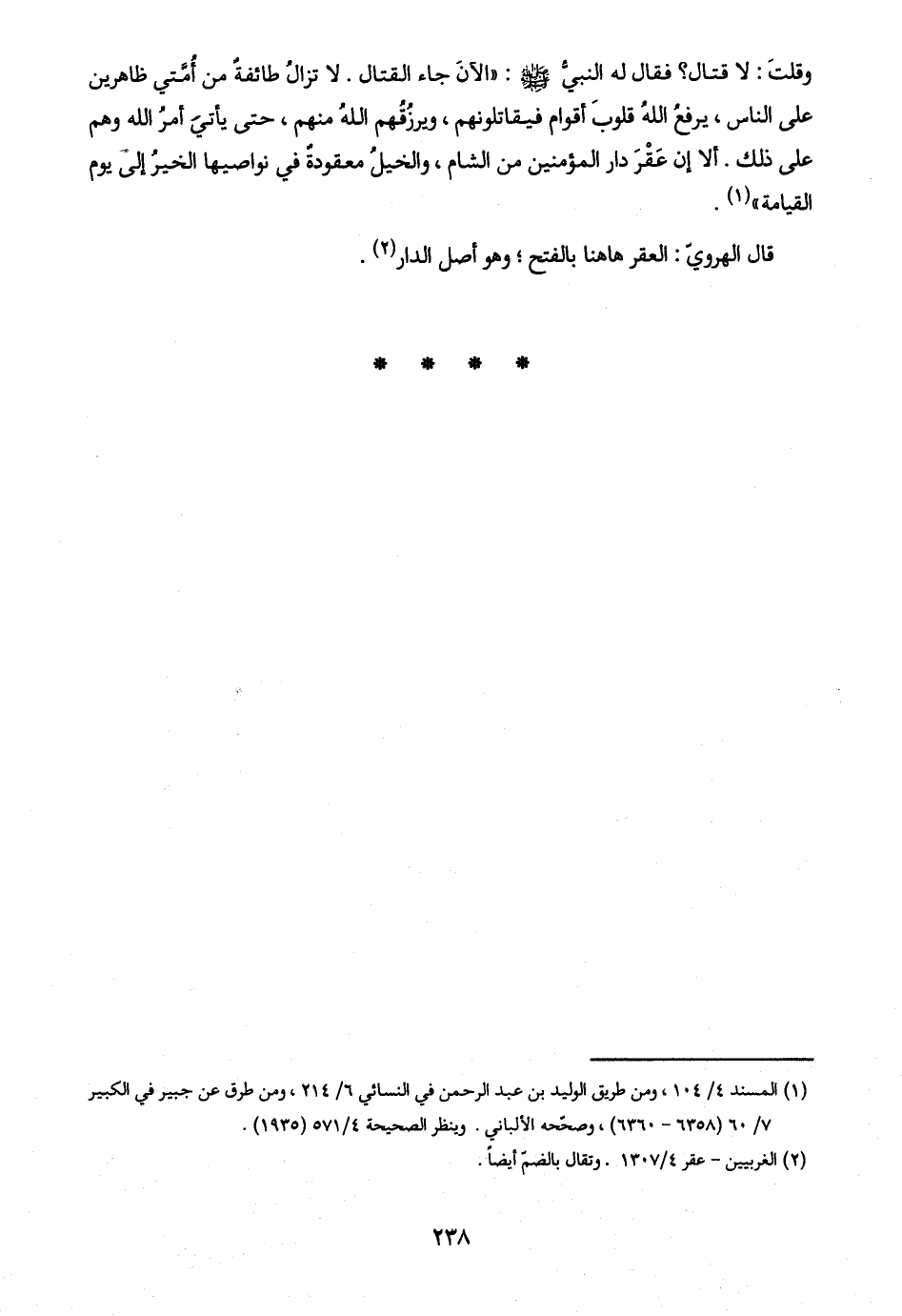 وقلتَ: لا قتال؟ فقال له النبيُّ -صلى اللَّه عليه وسلم-: "الآنَ جاء القتال. لا تزالُ طائفةٌ من أُمَّتي ظاهرين على النّاس، يرفعُ اللَّهُ قلوبَ أقوام فيقاتلونهم، ويرزُقُهم اللَّهُ منهم، حتى يأتيَ أمرُ اللَّه وهم على ذلك. ألا إن عَقْرَ دار المؤمنين من الشام، والخيلُ معقودةٌ في نواصيها الخيرُ إلى يوم القيامة" (١).
