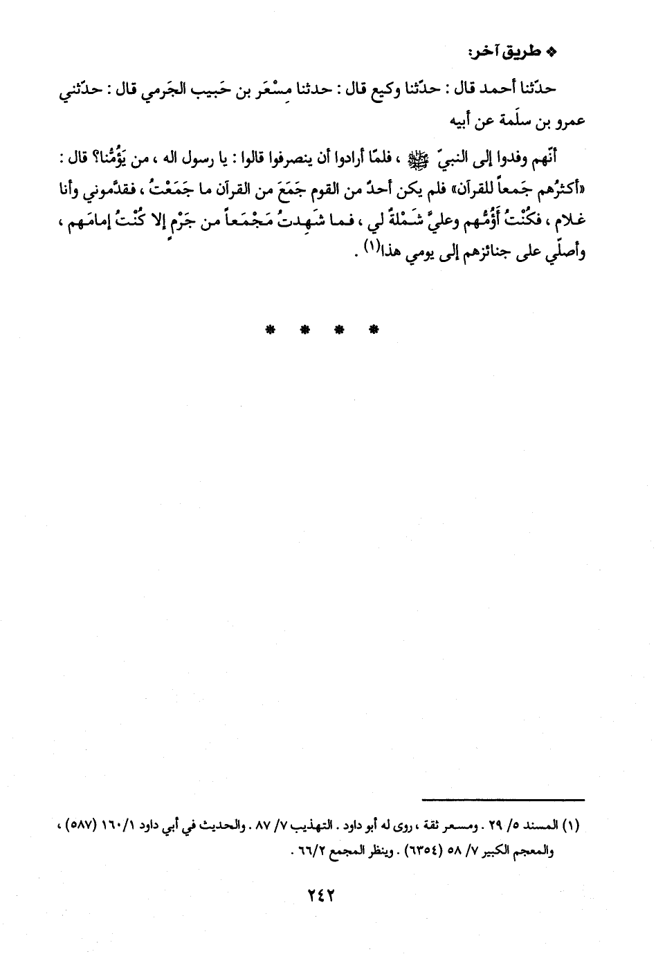 حدّثنا أحمد قال: حدّثنا وكيع قال: حدّثنا مِسْعَر بن حَبيب الجَرمي قال: حدّثني عمرو بن سلَمة عن أبيه: