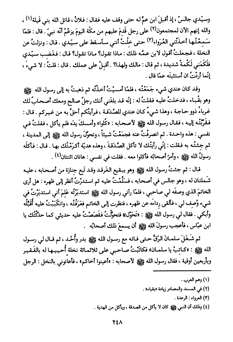 وقد كان عندي شيء جَمَعْتُه، فلمّا أمسيْتُ أخذْتُه ثم ذهبتُ به إلى رسول اللَّه -صلى اللَّه عليه وسلم- وهو بقُباء، فدخلتُ عليه فقلتُ له: أنّه قد بلغَني أنك رجلٌ صالح ومعك أصحابٌ لك غرباءُ ذوو حاجة، وهذا شيءٌ كان عندي للصَّدَقة، فرأيتُكم أحقَّ به من غيركم. قال: فقَرَّبْتُه إليه، فقال رسول اللَّه -صلى اللَّه عليه وسلم- لأصحابه: "كُلوا" وأمسكَ يدَه فلم يأكل، فقلتُ في نفسي: هذه واحدة. ثم انصرفْتُ عنه فجمَعْتُ شيئًا، وتحوَّلَ رسول اللَّه -صلى اللَّه عليه وسلم- إلى المدينة، ثم جِئتُه به فقلت: إنّي رأيتُك لا تأكل الصَّدَقةَ، وهذه هديّة أكرَمْتُك بها. قال: فأكلَه رسولُ اللَّه -صلى اللَّه عليه وسلم-، وأمرَ أصحابَه فأكلوا معه. فقلت في نفسي: هاتان اثنتان (٤).