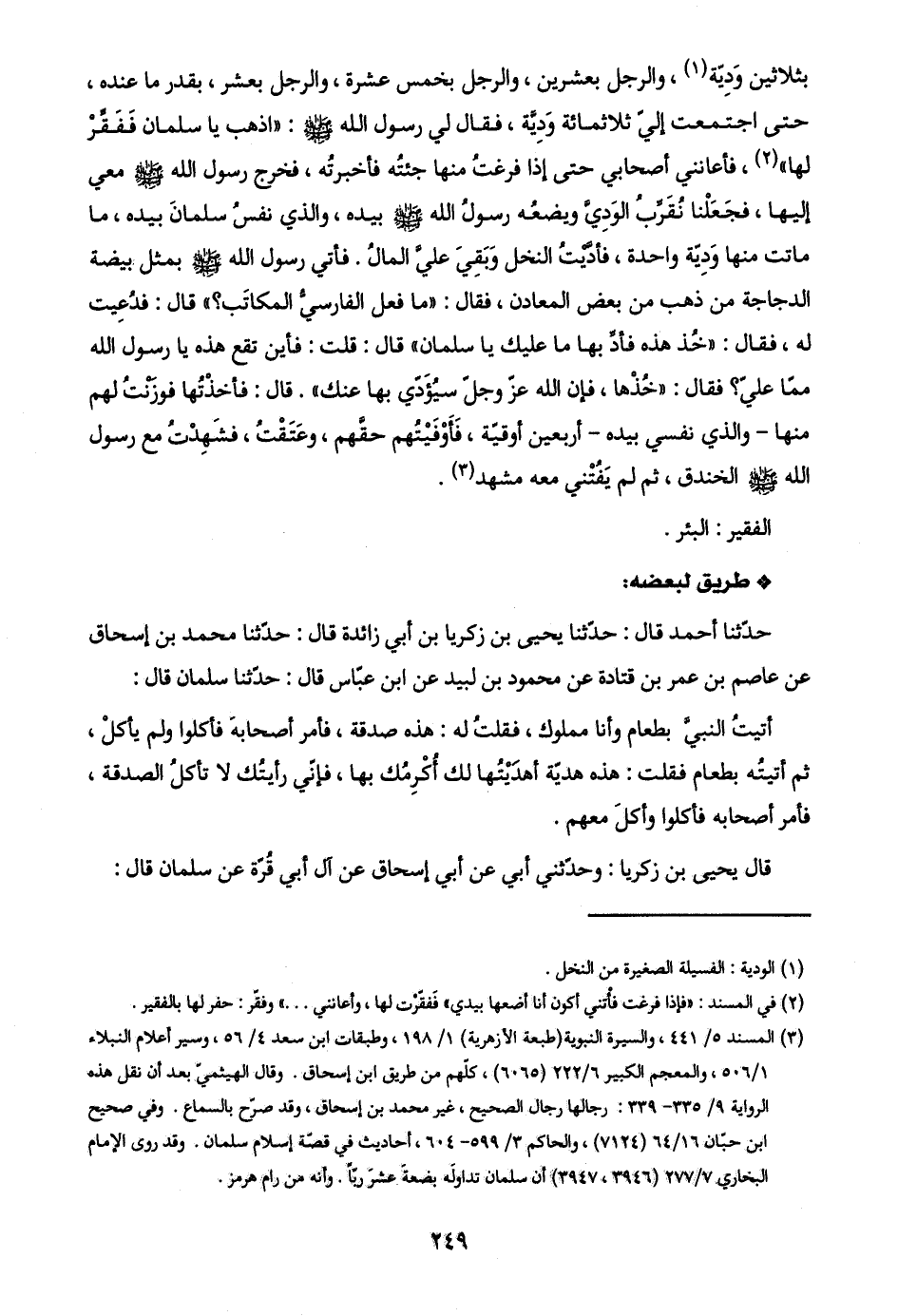 (٣) المسند ٥/ ٤٤١، والسيرة النبوية (طبعة الأزهرية) ١/ ١٩٨، وطبقات ابن سعد ٤/ ٥٦، وسير أعلام النبلاء ١/ ٥٠٦، والمعجم الكبير ٦/ ٢٢٢ (٦٠٦٥)، كلّهم من طريق ابن إسحاق. وقال الهيثميّ بعد أن نقل هذه الرواية ٩/ ٣٣٥ - ٣٣٩: رجالها رجال الصحيح، غير محمد بن إسحاق، وقد صرّح بالسماع. وفي صحيح ابن حبّان ١٦/ ٦٤ (٧١٢٤)، والحاكم ٣/ ٥٩٩ - ٦٠٤، أحاديث في قصّة إسلام سلمان. وقد روى الإمام البخاري ٧/ ٢٧٧ (٣٩٤٦، ٣٩٤٧) أن سلمان تداولَه بضعةَ عشرَ ربًّا. وأنه من رام هرمز.